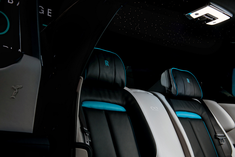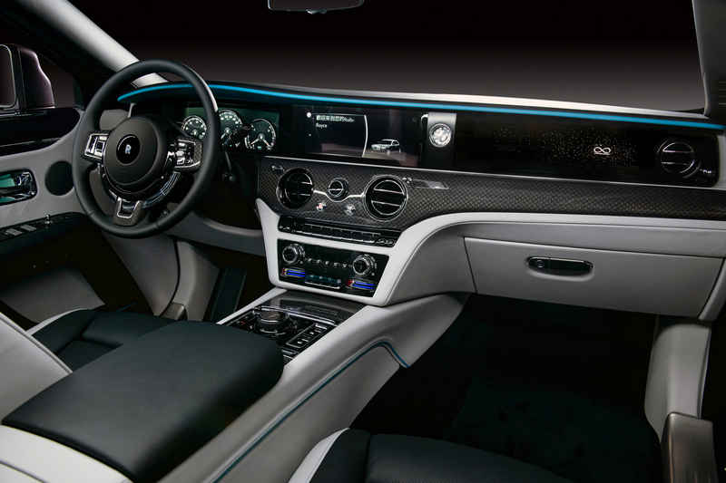 鐘錶兩側為全新Ghost 獨有的創新設計—星光飾板,採用850顆點點繁星環繞著散發幽幽光芒的無限標識,星光飾板位於副駕駛一側,下方安裝152支LED燈源可點亮星光飾板,內飾燈光關閉時星空與標識完全隱形。其色調與車內鐘錶和儀錶照明和諧一致,而為保證標識光源均勻,LED燈源採用厚度為2公釐的光導,表面配有逾9萬個鐳射蝕刻點,不僅保證標識被均勻點亮,更模擬星空閃爍效果,視線所及點點繁星,與星光頂篷遙相呼應。