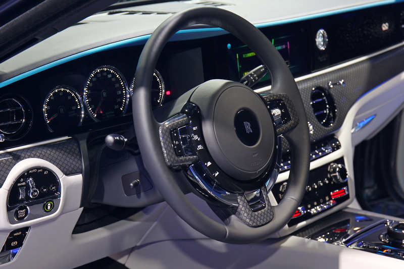 呼應Black Badge Ghost強烈的機械風格,內飾材質的應用也可謂是 Ghost 以約馭博設計理念的完美寫照。勞斯萊斯的工匠們採用先進精細的編織技藝,在碳纖維和金屬纖維織料上織出鑽石菱紋,盡情彰顯Black Badge Ghost最獨特年輕潮流之美。Black Badge Ghost內飾襯底採用多層實木,內飾頂層表面先用黑色鋪墊,之後再墊上科技纖維層。為保證飾面光滑平整,所有部件需經過一小時的100度高溫處理,再進行噴砂,預處理過後進行六層噴漆,手工打磨拋光後再進行組裝。