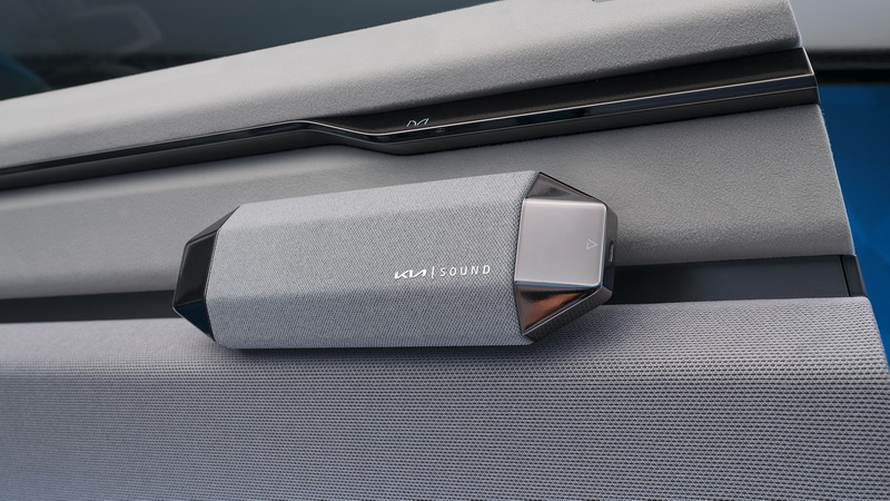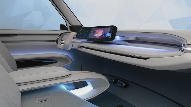內裝座椅材質以回收塑料與羊毛纖維混製而成,視覺所見看不到過多的實體按鍵,駕駛儀表與娛樂資訊顯示皆整合在一具超大的27吋螢幕內,方向盤則非傳統的圓形樣式反而更類似飛機手把的概念,另外透過車頂的大面積全景式天窗可導入大量自然光,除了讓視覺不感侷促外亦能讓車內乘客享受陽光洗禮,前面有說到EV9是部大型三排七人座車型,標準模式下是以232的座椅排列方式呈現,若切換至”Pause Mode”第一排座椅可向後旋轉,而中排座椅則變收折成為平板桌面,讓車艙變為可面對面的聊天場域,另外還有一種” Enjoy Mode”可讓全部座椅皆向後旋轉,打開尾門後便能成為簡易的戶外劇場。