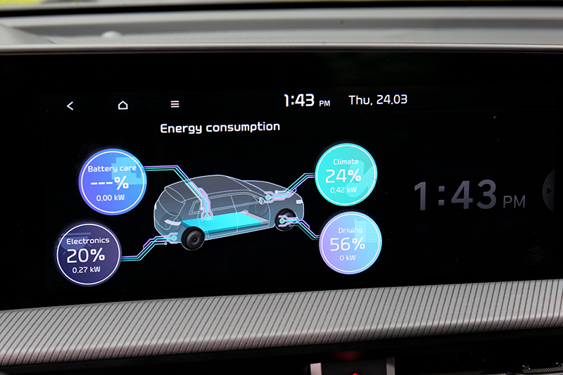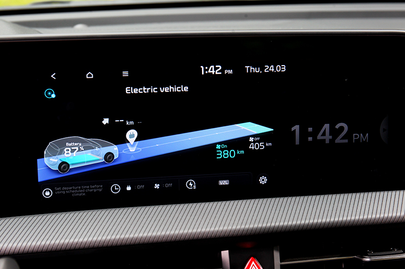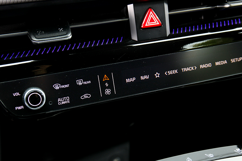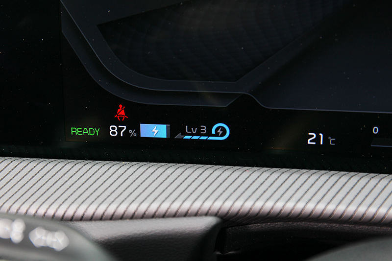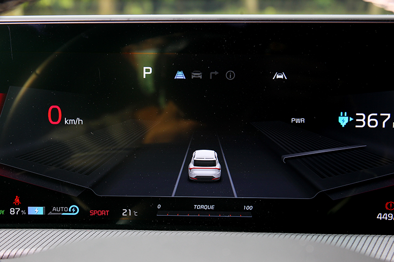 坐進車艙首先目光就被12.3吋構成的曲面螢幕吸引,除了象徵未來的科技感,駕駛也能透過數位儀表與中控螢幕也能觀看電量、剩餘里程、模式及設定預約充電時間、V2L斷電%數、模擬加速聲浪等功能。再來駕駛導向規劃的旋鈕式排檔與鞍座造型,及下方置物空間和無線充電位置等規劃,不僅兼具實用也是和曲面螢幕營造創新感受的重要元素。