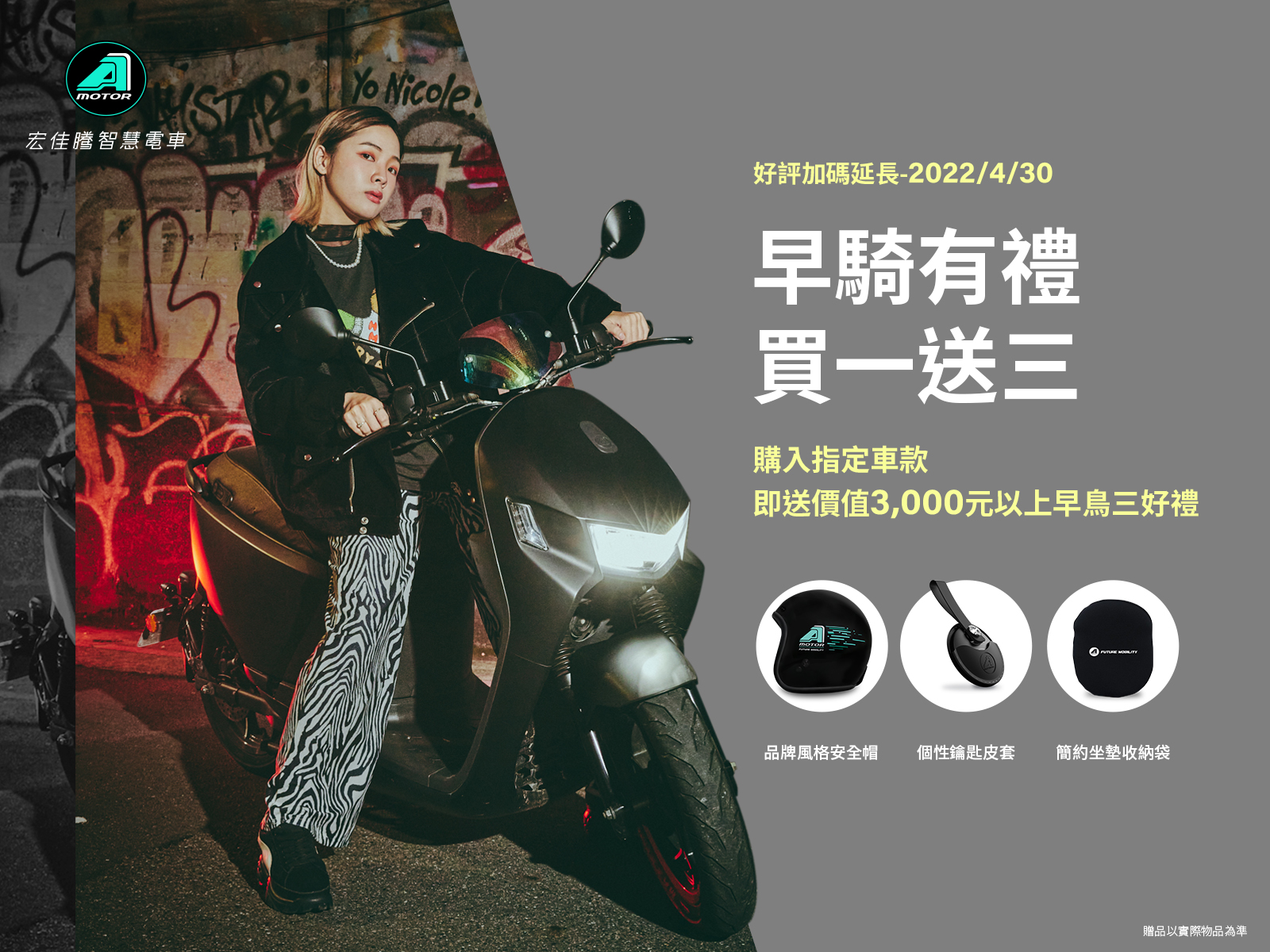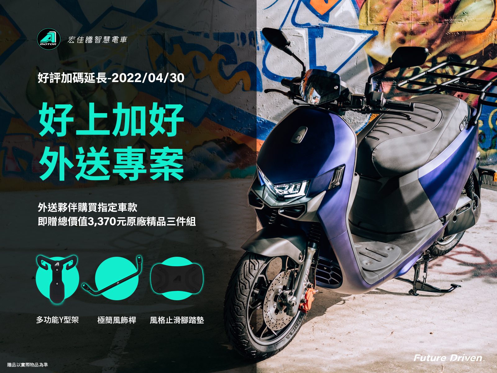 此外,政府日前宣布 2050 淨零排放路徑及策略,展現推動運具電氣化決心,六都與各縣市政府亦陸續公布 2022 年電動機車補助辦法,鼓勵全民換購電動機車;宏佳騰齊聲響應政府政策加碼將「早騎有禮 買一送三」與「好上加好 外送專案」優惠延長至 4 月 30 日,讓消費者購買 Ai-1 或 Ai-3 系列車款皆可擁有總價值超過 3,000 元的超值專屬禮回饋。