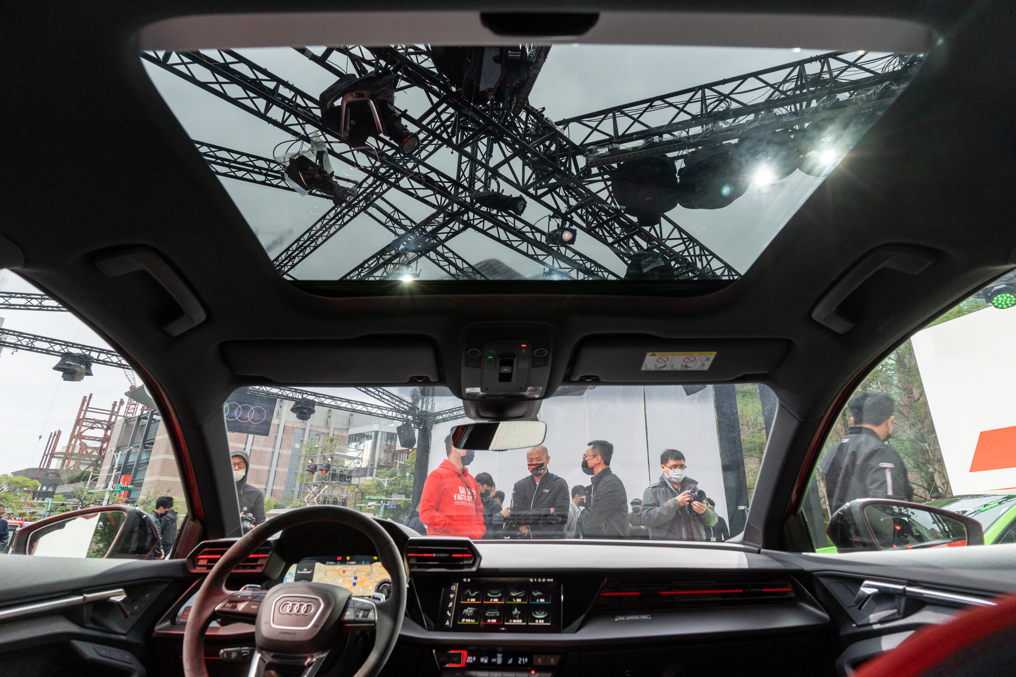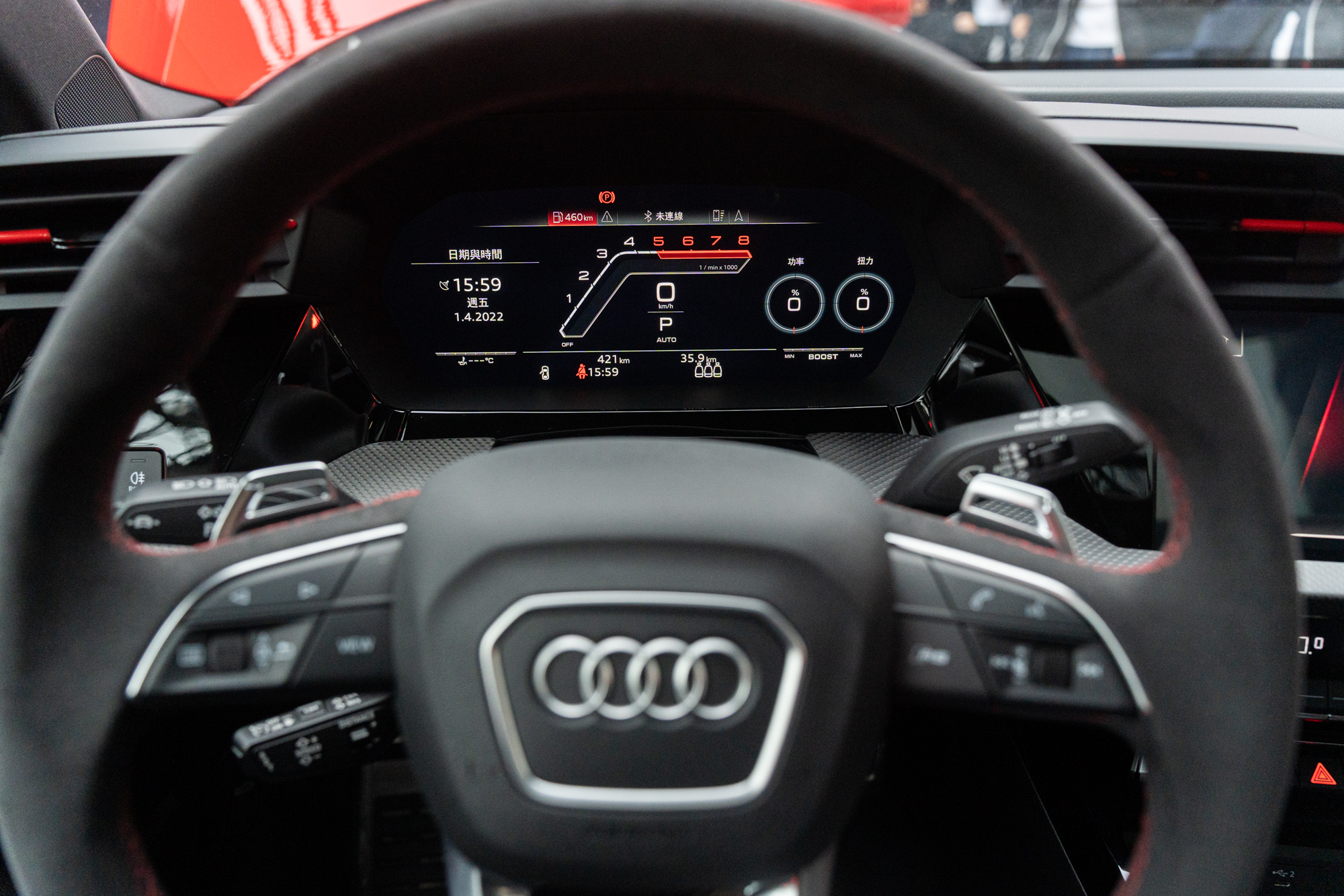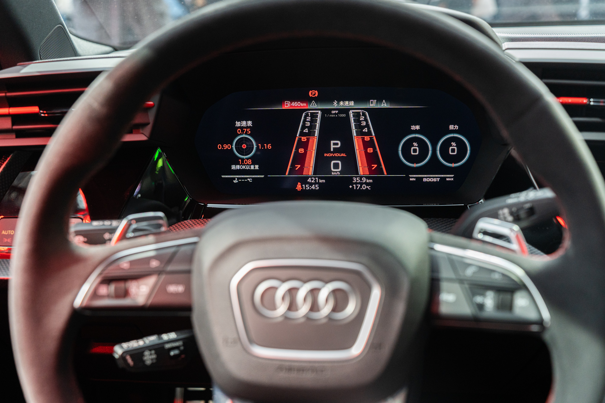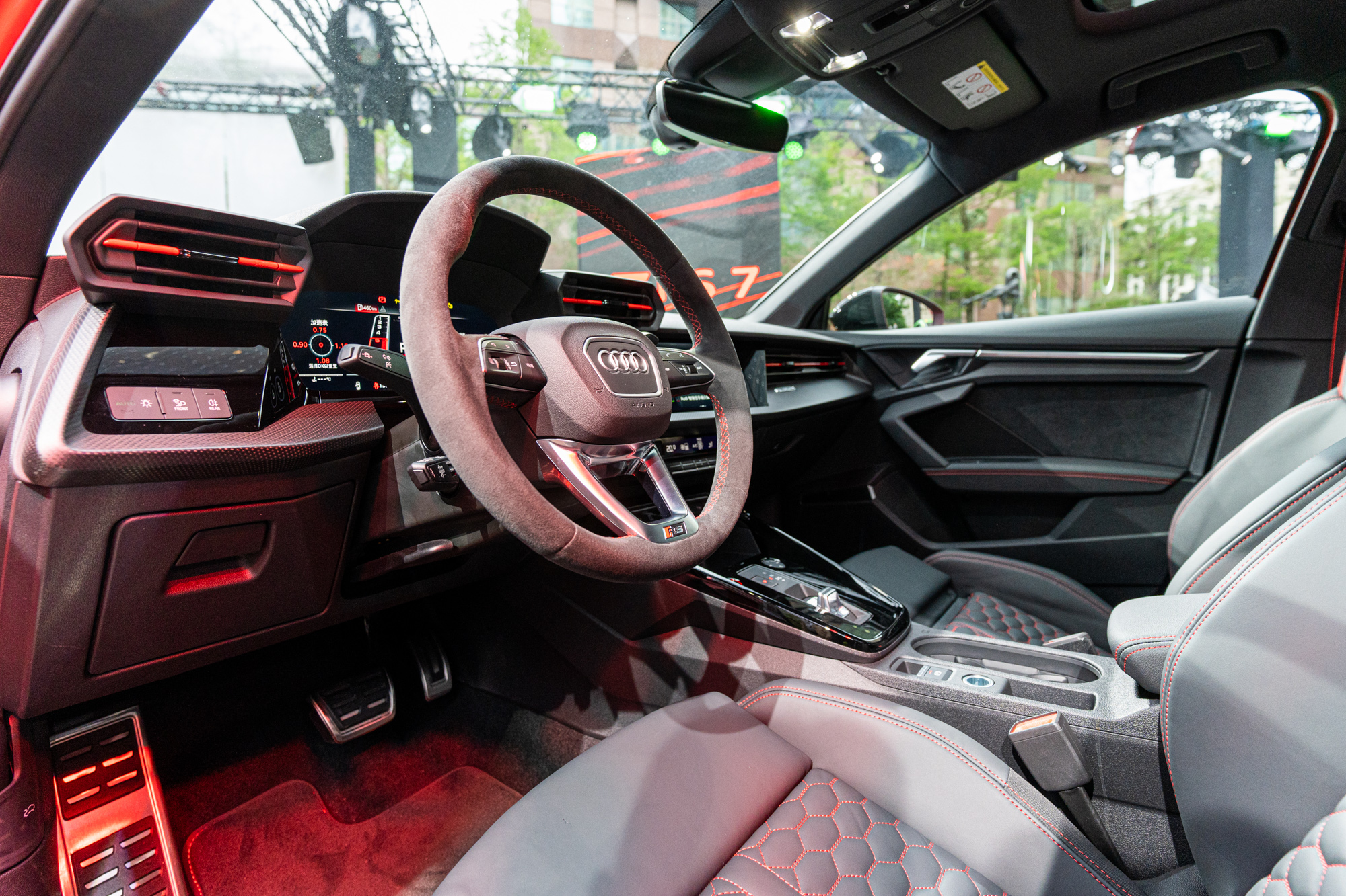 全新 RS 3 Sportback 全車座艙搭載 RS 專屬內裝套件,舉凡 RS 專屬真皮多功能跑車方向盤、碳纖維內裝飾板、RS 專屬 Fine Nappa 真皮跑車座椅等競技化套件。車內也搭載了以 RS 賽道設計風格為主的 12.3 吋 Audi 全數位虛擬駕駛座艙plus(RS design)、10.1 吋 MMI navigation plus 多媒體系統,全景式電動玻璃天窗,搭配 Bang & Olufsen 3D 環繞音響系統等。