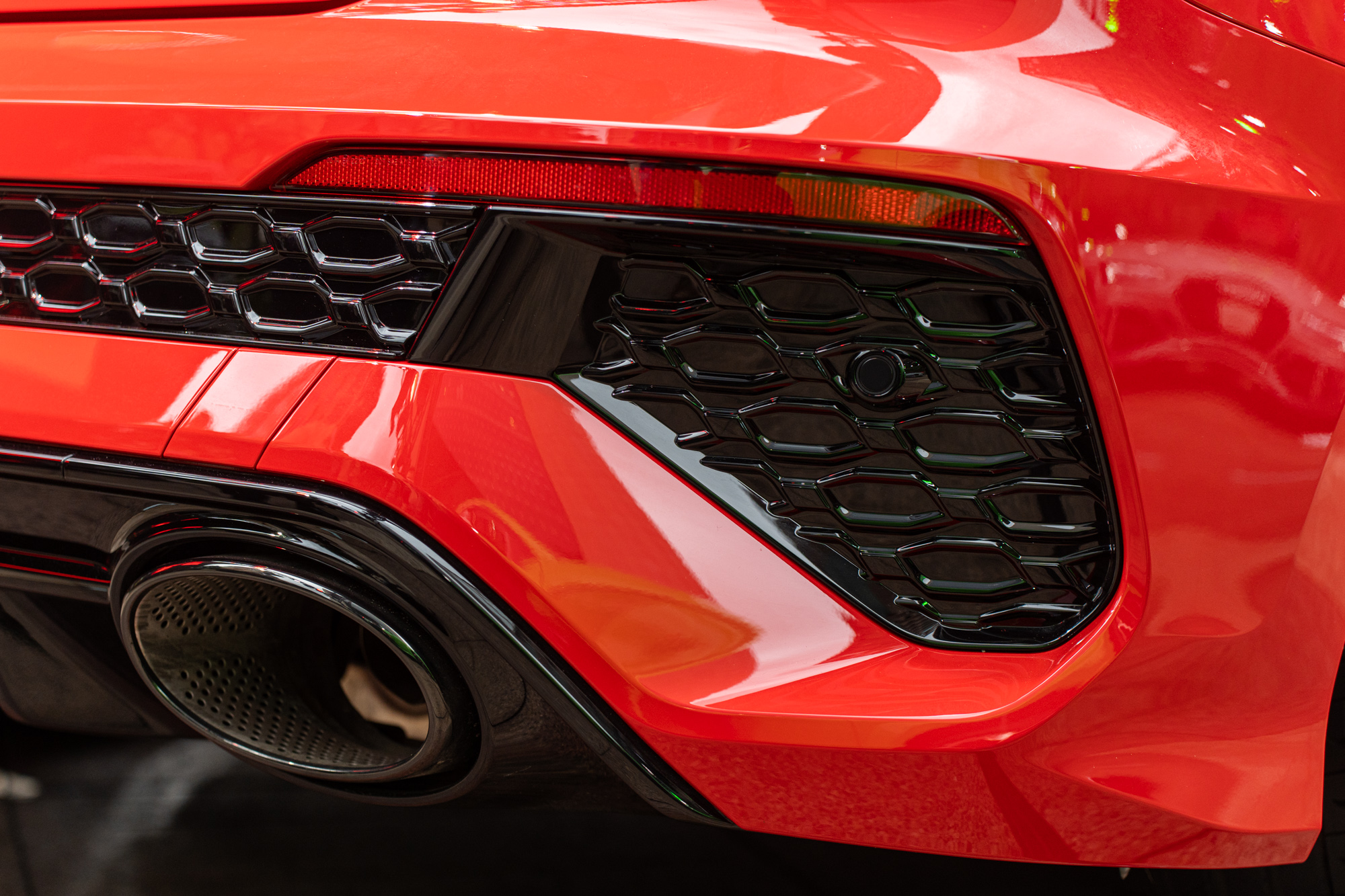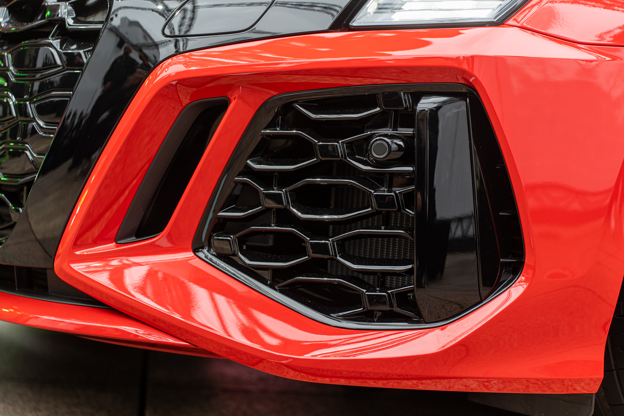 全新 RS 3 Sportback 延續 A3 車系前衛設計筆觸,融入許多競技元素強化其高性能掀背車款必備的鮮明特質,採用高光澤黑色烤漆的寬幅單體式六角型水箱護罩,及前保桿兩側大型斜角設計進氣口,內建開口更寬大的蜂巢格柵,採用內凹折線設計的車側鈑件,最醒目之處絕對是充滿視覺張力的外擴輪拱,以及前葉子板後緣專屬散熱導氣口,而車側肩線、傾斜 C 柱設計、楔形尾燈組、後尾門擾流翼,以及後保桿下方 RS Sport 橢圓形雙出式樣排氣尾管和後下擾流分流器,對應輪下 19 吋 RS 專屬 5 輻 Y 型設計鋁合金輪圈及紅色塗裝煞車卡鉗等競技化配件。