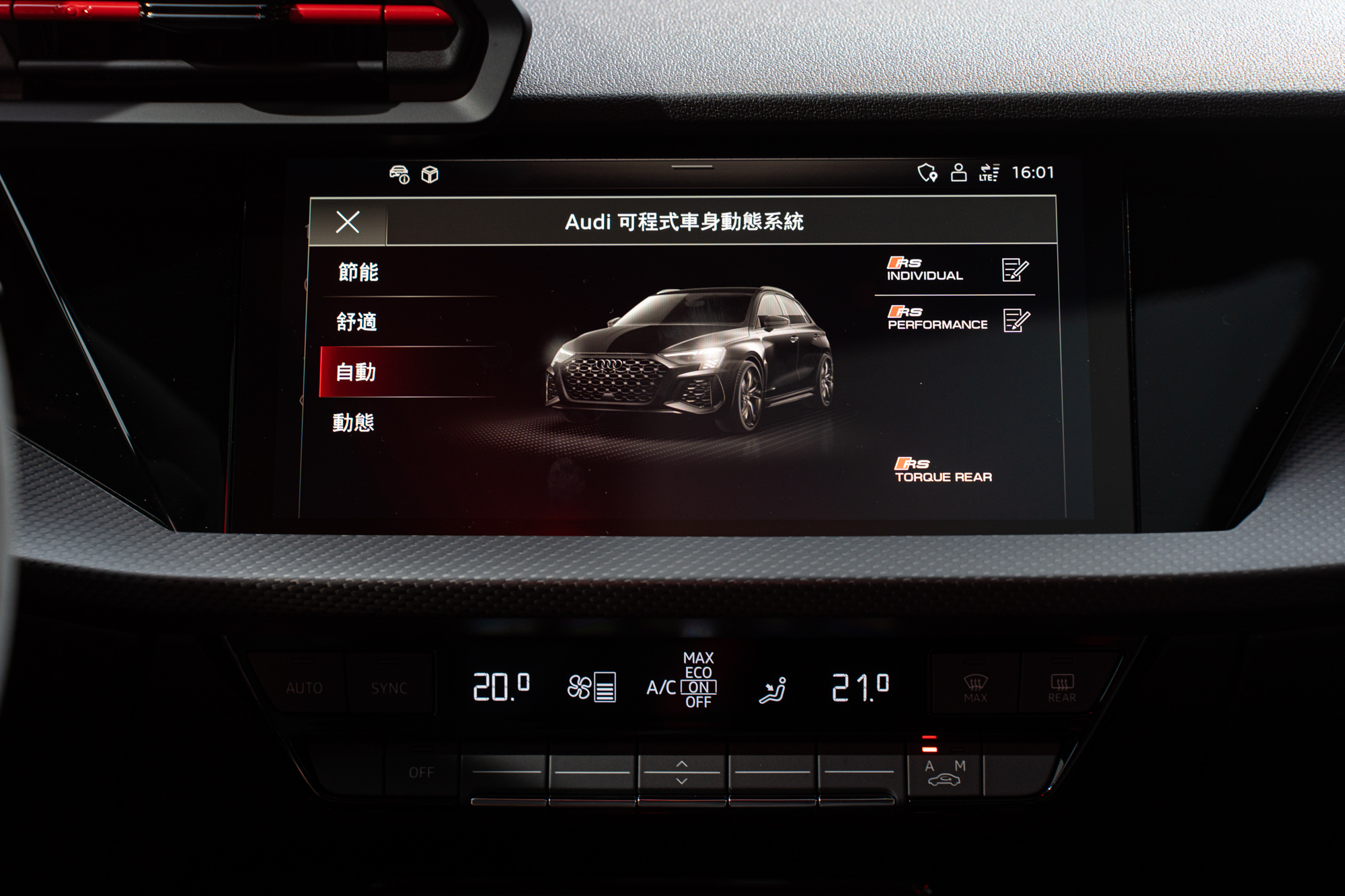 動力操控方面,全新R S 3 Sportback 除標配 Audi drive select 可程式車身動態系統,具備節能、舒適、自動、動力等四種駕駛模式,並提供 RS Individual、RS Performance 及 RS Torque Rear等賽道駕控/漂移模式,搭配跑車式轉向系統,與 RS 專屬運動化電子可調式阻尼懸吊及 quattro 智慧型恆時四輪傳動系統,大幅提升底盤的操控極限。全新 RS 3 Sportback 也是四環旗下首款配置全新開發之操駕利器 –RS 專屬後軸扭力分配系統(RS Torque Splitter)的車款,這套裝置即可主動且精準調配後軸之間的扭力輸出分配比例,當車輛在高速過彎的激烈動態駕駛過程中,RS 專屬後軸扭力分配系統能迅速將驅動扭矩增加到車輪載荷較高的外側後輪,藉此有效降低轉向不足的情況,並持續為車輛提供最大程度的抓地力和穩定性,此外在封閉道路上進行極限操駕時,亦能透過 RS 專屬後軸扭力分配系統,將所有動力僅施加到單一後輪上,使車輛依然能在受控制的情況下做出橫向漂移之動態軌跡,而精準分配驅動扭力比例的關鍵,取決於駕駛者在 Audi drive select 中所選擇的駕駛模式及當下的駕駛情況而定。