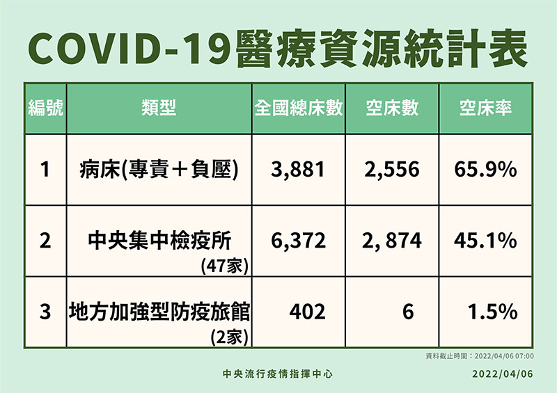 許多人擔心若確診人數持續增加,台灣是否可能像鄰近國家一樣,出現醫療量能崩潰的情形,對此,陳時中回應,根據醫療資源統計,現全台病床(專責+負壓)空床率仍維持65.9%上下,疫情較嚴重的北部地區,空床率稍微低一些,約接近50%;中央集中檢疫所空床率則仍有45.1%。