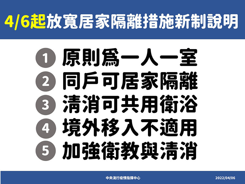 目前因匡列隔離者人數多,陳時中於今宣布居家隔離新制。過去要求被隔離者需保持一人一戶,而現調整為「如同住家人皆被匡列,以一戶為單位隔離」,且經清消後可共用衛浴,唯境外移入者不適用。