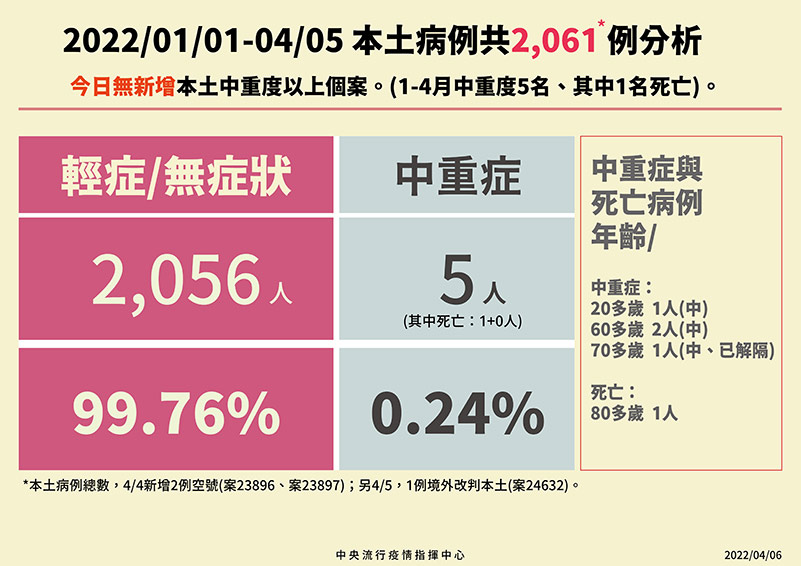 Omicron具有高傳播力,然而輕症/無症狀比例高,陳時中表示,自今(2022)年1月1日至4月5日止,本土共累積2061例個案,其中輕症/無症狀者共2056人,約佔總染疫人數99.76%;中重症患者共5人,佔比0.24%;死亡人數一名。