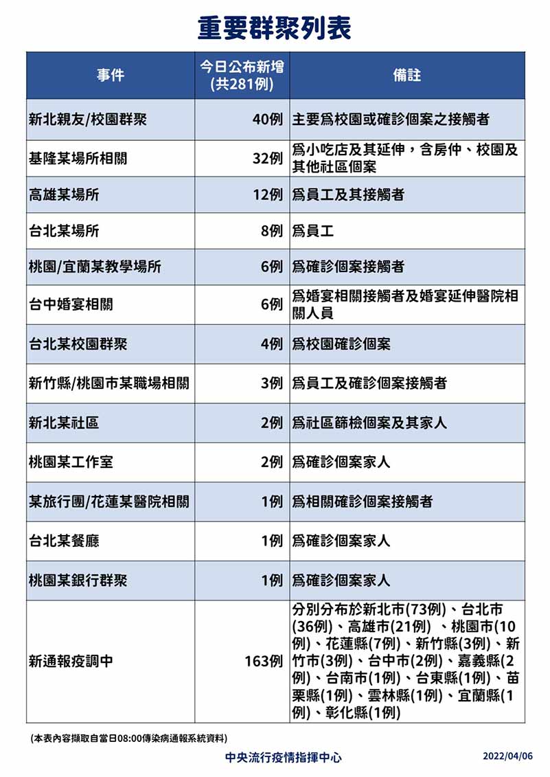 【健康醫療網/記者賴欣平報導】新冠肺炎本土個案持續增加,中央流行疫情指揮中心公布,今(4/6)新增281例本土個案,已連續兩日增加逾200名個案;境外移入則新增78例,包含落地採檢27例及居家檢疫51例。另現有確診個案涵蓋全台17個縣市,而新增個案數最多的前三個縣市分別為新北市(115例)、台北市(45例)及高雄市(37例)。