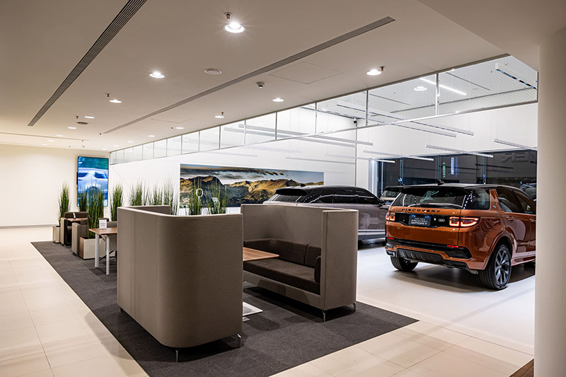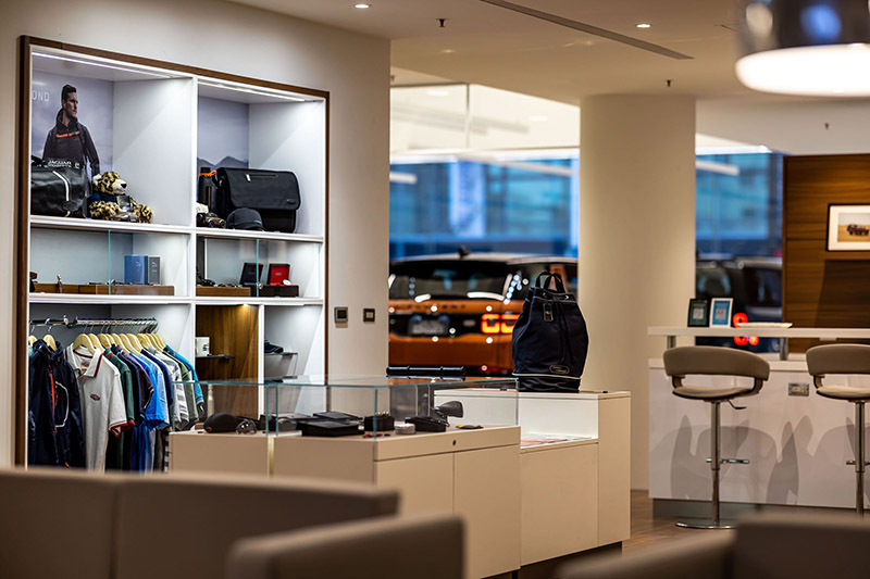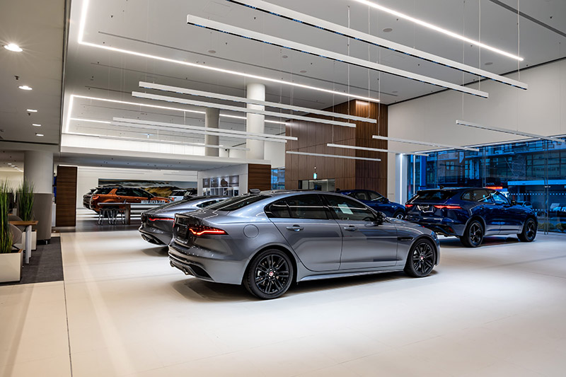 位於 1 樓的新車展示區與交車區,面寬長約 16 公尺,樓層設計挑高 6.4 公尺,呈現方正的賞車空間,共可展出 14 輛新車,採用 Low-E 玻璃及超白玻璃,創造兼具節能與高透光度,提供來賓更為舒適尊榮的賞車環境。兩間獨立交車室採用全台唯一全黑立面設計,減少色彩對於車輛的干擾,更專注於新車的輪廓、質地以及光影形塑而成的現代奢華風格氛圍,使準車主於交車時更能仔細品味獨具英倫品味的豪華座駕。3 樓設有原廠認證中古車專區,共可展示 18 輛車款,提供更為多元的購車選擇。