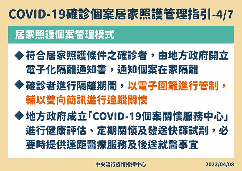 【健康醫療網/記者賴欣平報導】中央流行疫情指揮中心今(4/8)日表示,為持續推動「新台灣模式」,達到「正常生活、積極防疫、穩健開放」的目標,指揮中心持續針對確診者進行「重症清零,輕症有效控管」之策略,並訂定「COVID-19確診個案居家照護管理指引」因應無法掌握何時可能大規模爆發的疫情。