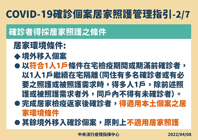 2. 完成居家檢疫返家後確診者,得適用本土個案之居家環境條件。