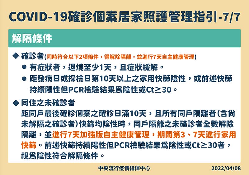 2. 同住之未確診者:距同戶最後確診個案之確診日滿10天,且所有同戶隔離者(含尚未解隔之確診者)快篩均陰性時,同戶隔離之未確診者全數解除隔離,並進行7天加強版自主健康管理,期間第3、7天進行家用快篩。前述快篩持續陽性但PCR檢驗結果為陰性或Ct≥30者,視為陰性符合解隔條件。