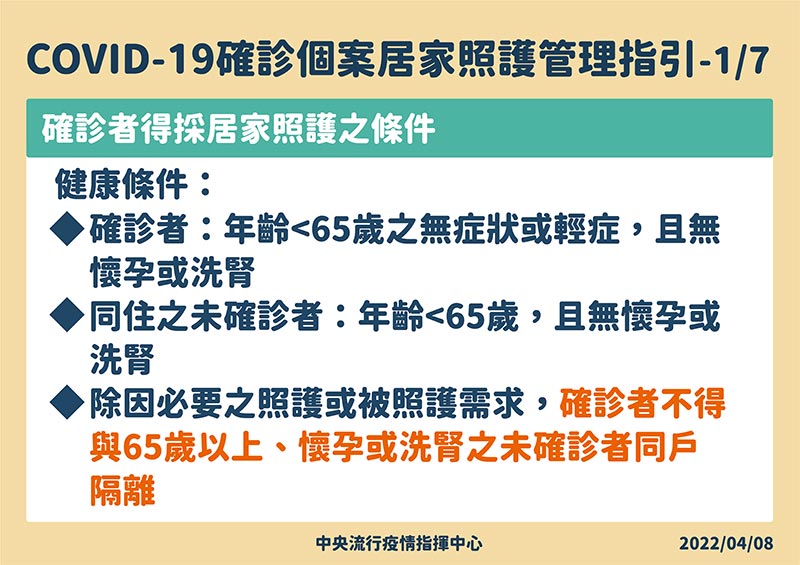 COVID-19確診個案居家照護管理指引中提到:首先,確診者健康條件須符合年齡<65歲之無症狀或輕症,且無懷孕或洗腎。同住未確診者年齡<65歲,且無懷孕或洗腎。除因必要之照護或被照護需求,確診者不得與65歲以上、懷孕或洗腎之未確診者同戶隔離。