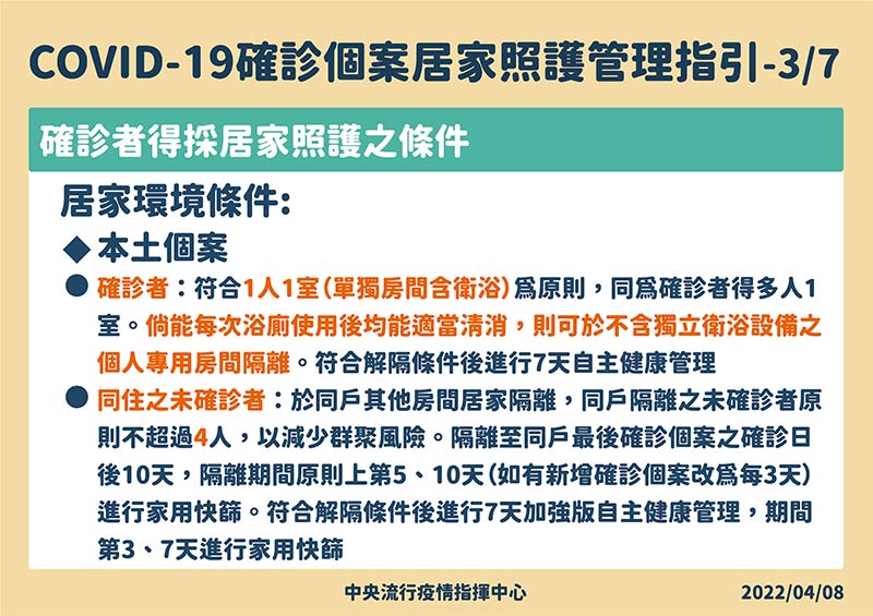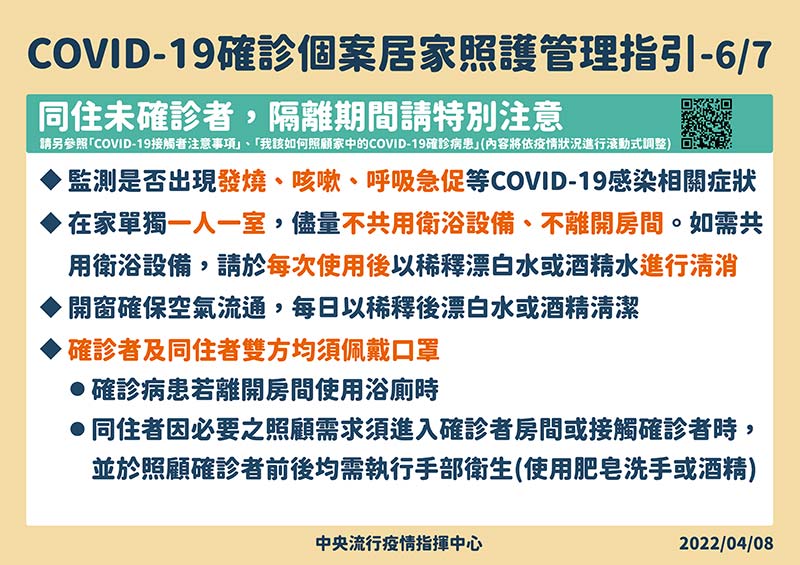 3. 同住之未確診者,請另參照「COVID-19接觸者注意事項」及「我該如何照顧家中的COVID-19確診病患」(內容持續修訂中),特別注意: