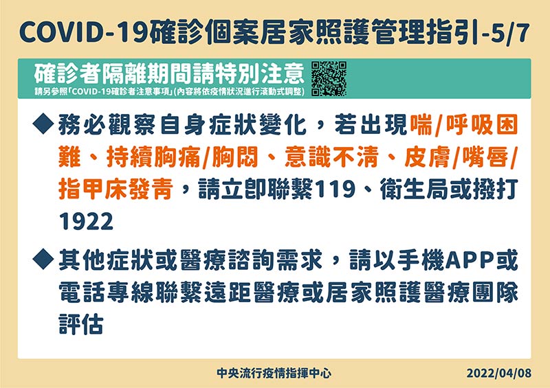 (2) 務必觀察自身症狀變化,若出現喘、呼吸困難、持續胸痛、胸悶、意識不清、皮膚或嘴唇或指甲床發青等症狀,立即撥打119、衛生局或1922。
