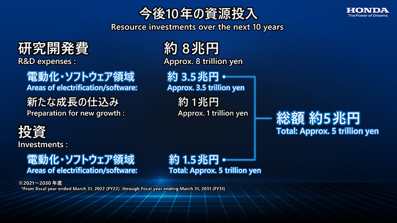 如同前言所說的,Honda在未來10年在研發上的預算將達約8兆日圓,其中電動車與其周邊軟體的開發投資將達5兆日圓,同時因應全新的布局,在新技術領域與資源共享部分也將投資達1兆日圓;並且以每年100億日圓的金額,積極投資具高潛力先進技術與商業模式的新創公司,另外,Honda在2022年3月還對外發行了總計達27.5億美元的綠色債券,期望籌措更多資金用於開發電動車與燃料電池車款,以利加快達到環境零影響的社會責任目標。