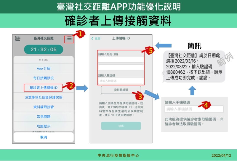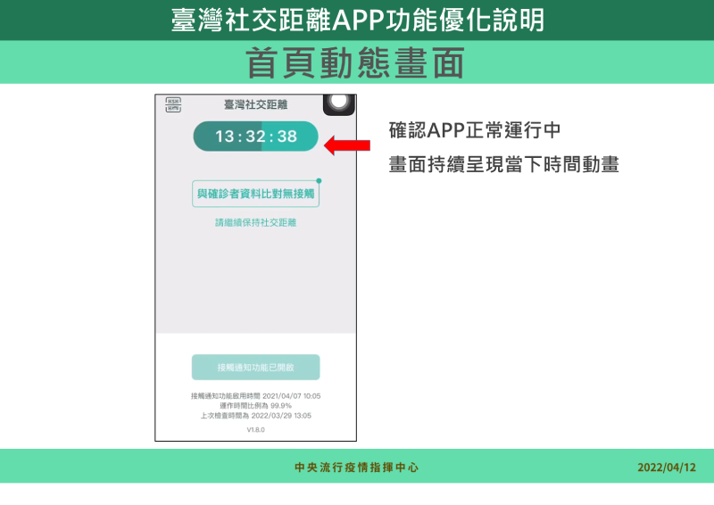 為了更全面性地使用,指揮中心優化此APP功能,包含「首頁動態畫面」及「確診者上傳接觸資料」等部分,「首頁動態畫面」為方便用戶確認APP是否正常運作;「確診者上傳接觸資料」則由衛生單位通知確診民眾操作APP以取得驗證碼後,由系統上傳其隨機ID及活動區間資料。