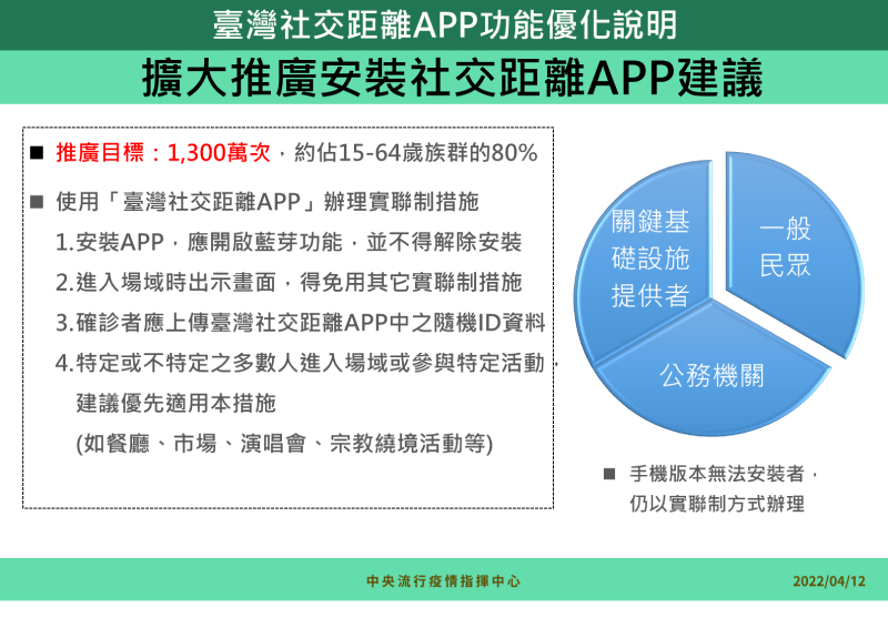為提高「臺灣社交距離APP」使用率,將鼓勵公務機關及關鍵基礎設施提供者之工作人員安裝使用,並鼓勵一般民眾一起使用。另建議特定或不特定之多數人進入場域或特定活動時,如餐廳、市場、演唱會或遶境等場域或活動,優先使用此APP做為科技防疫工具,在後續之實聯通知上會更快速精準。
