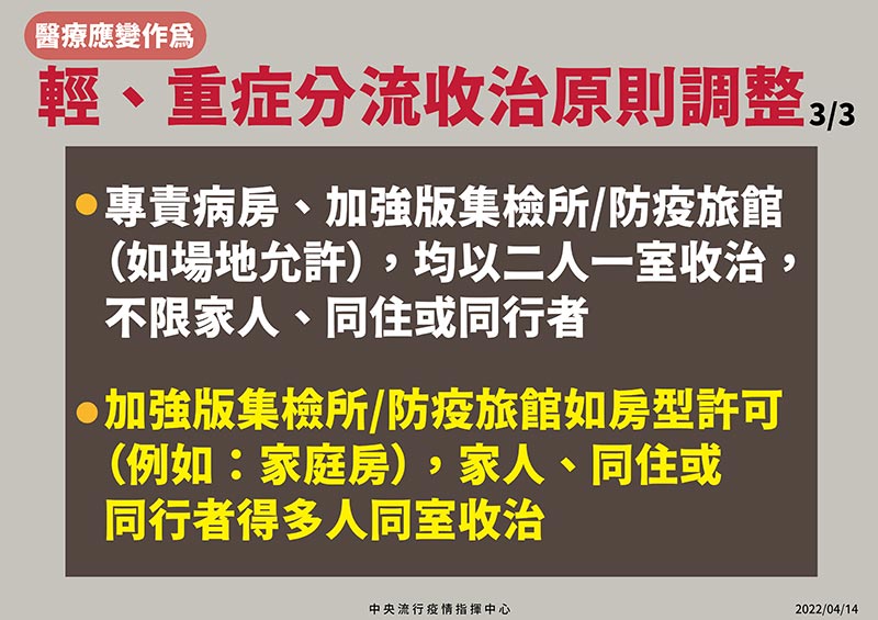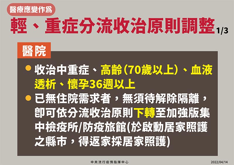 而因應新北市居家照護開跑,指揮中心醫療應變組副組長羅一均表示,各大醫療院所、集檢所、防疫旅館輕、重症分流收治原則亦隨之調整。包含將醫院收治年齡從65歲以上調整至「70歲以上」,或有血液透析需求及懷孕36週以上之孕婦,其他個案則以集檢所、防疫旅館或居家照護為主,讓醫院病床周轉流動可以更靈活。