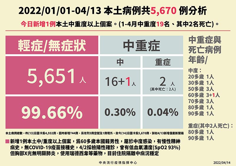 【健康醫療網/記者賴欣平報導】中央流行疫情指揮中心今(4/14)公布,本土個案新增874例,仍呈上升趨勢;境外移入則有108例,包含75例落地採檢及33例居家檢疫採檢。而經統計,自今(2022年)初至4月13日,全台共累積5670例確診個案,其中,中症病例17名、死亡病例則有2名,輕症/無症率約為99.66%。