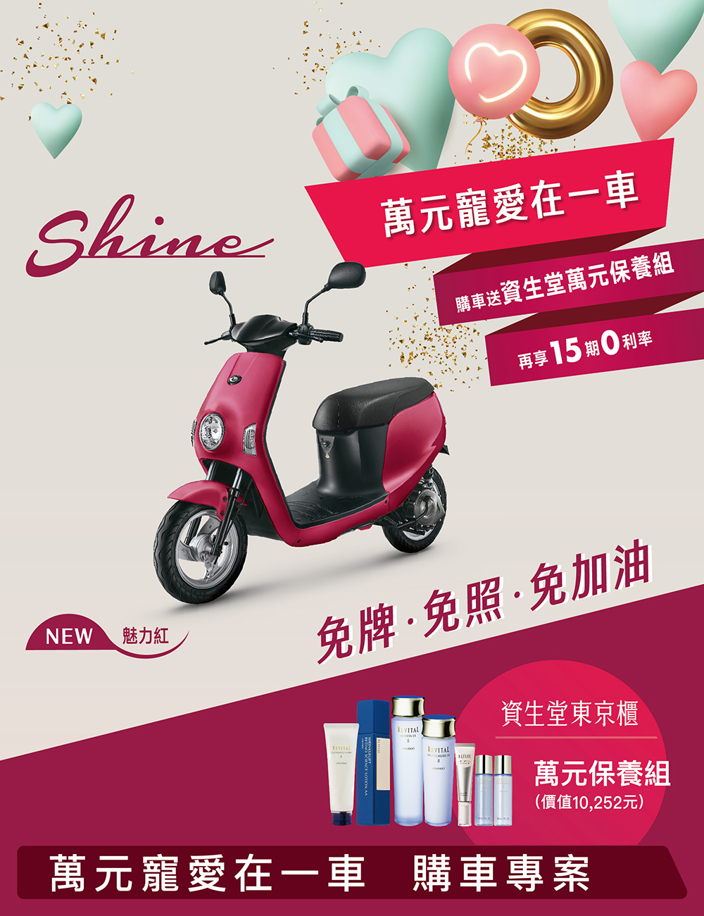即日起至 5/31 購買 Shine 搭配政府補助及購車優惠最低只要 35,980 元,再贈「資生堂頂級萬元保養組」(價值10,252 元)及 15 期 0 利率。而與 Gogoro 合作換電系統的 EZ1 車款及全台唯一快充電動車 iE125 也同享頂級保養組優惠。