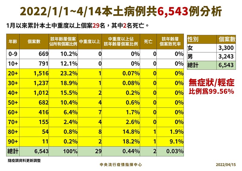 經統計,本土疫情現況自今(2022)年年初至昨日,共計6543人確診,其中輕症/無症狀人數為6514人,約佔整體確診人數的99.56%;然而,陳時中坦言,中症比例似有上升趨勢,今新增中症人數有10名,比例來到0.41%;重症人數則仍維持2位。