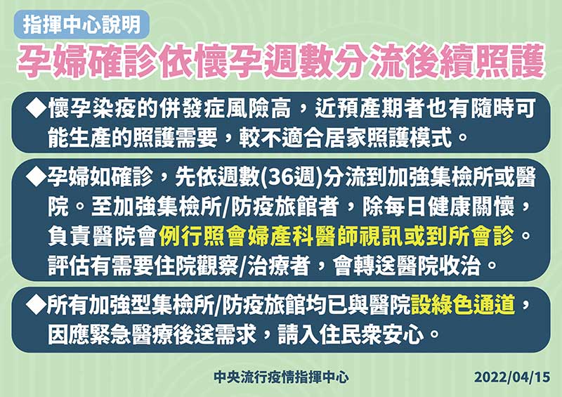 (二)孕婦如確診,先依週數(36週)及經第一線公衛人員評估後,分流到加強型集檢所/防疫旅館或醫院。至加強型集檢所/防疫旅館者,除每日健康關懷,負責醫院會例行照會婦產科醫師視訊或視情況到所會診,評估有需要住院觀察/治療者,會經綠色通道轉送醫院收治。
