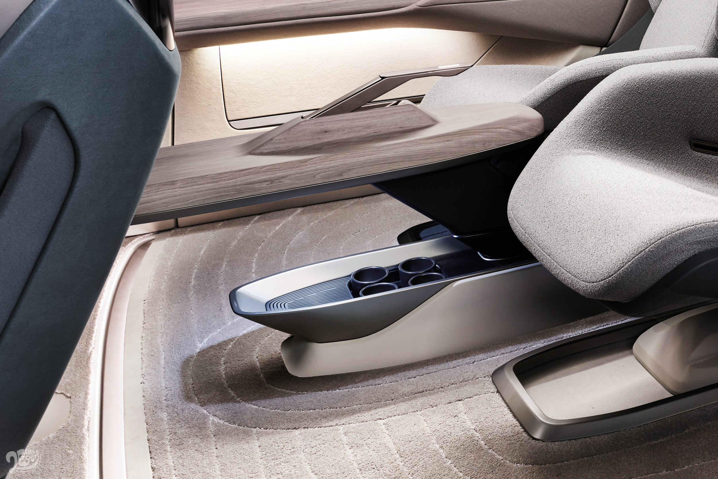 在 Level 4 自動駕駛的設計架構下,設計重心不再是駕駛行車,以乘客為中心的車艙體驗才是設計發展的核心,當踏入 Audi urbansphere concept 概念車時,從車身延伸的光影迎賓紅毯已準備提供賓至如歸的移動饗宴,車艙內採用三排 6 座設計,整體車艙使用柔和米色、灰色及綠色調系搭配永續的質材選用,形塑寬敞、舒適氛圍;車內控制區域配置於車門扶手面板,乘員透過觸控方式即可調整座椅,同時座椅亦可因應不同社交使用需求靈活調整,旋轉至面對面交談模式;當想享受自我時間時,座椅角度(至多傾斜 60 度)與可調式頭枕設計,打造寬敞專屬的享受空間。