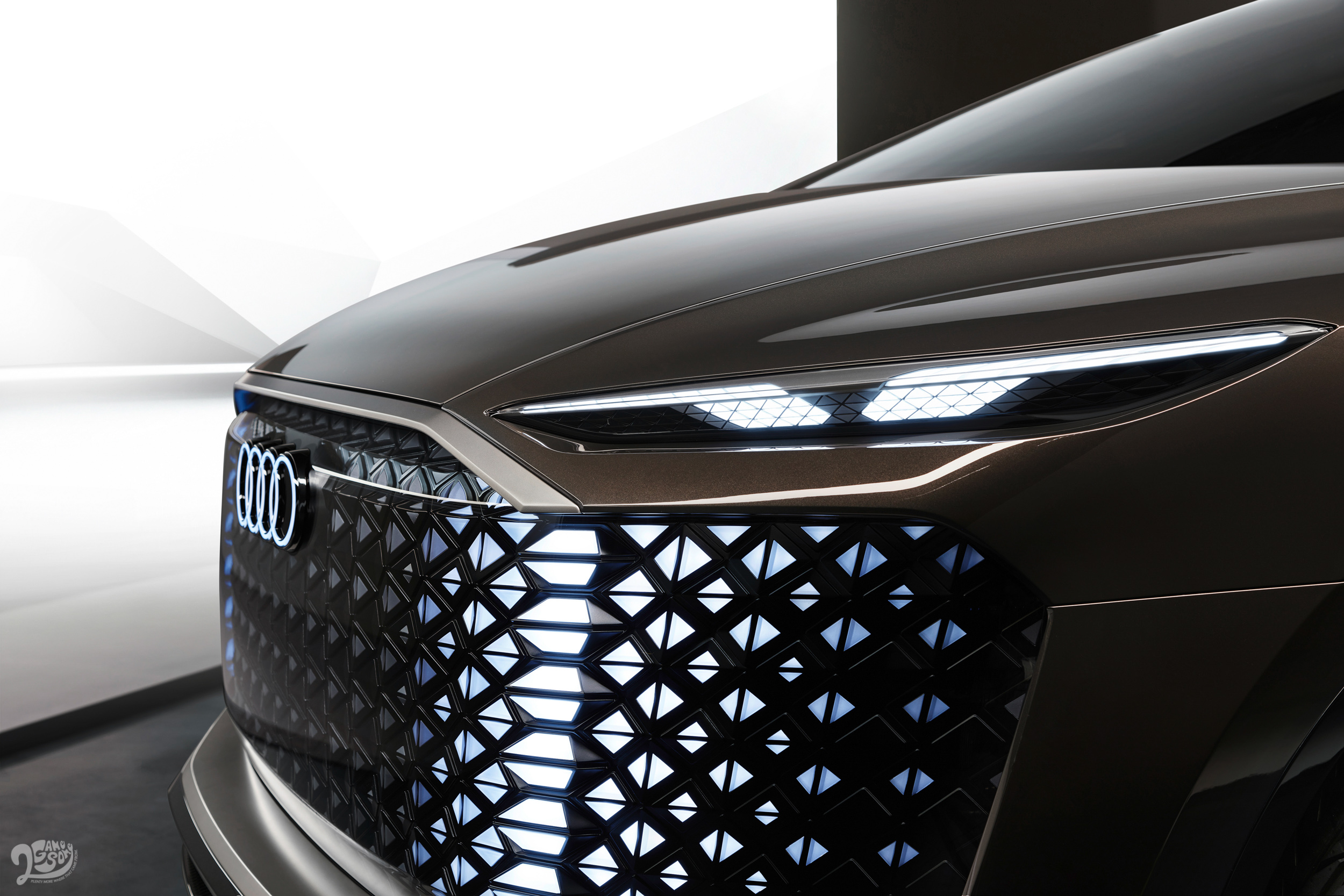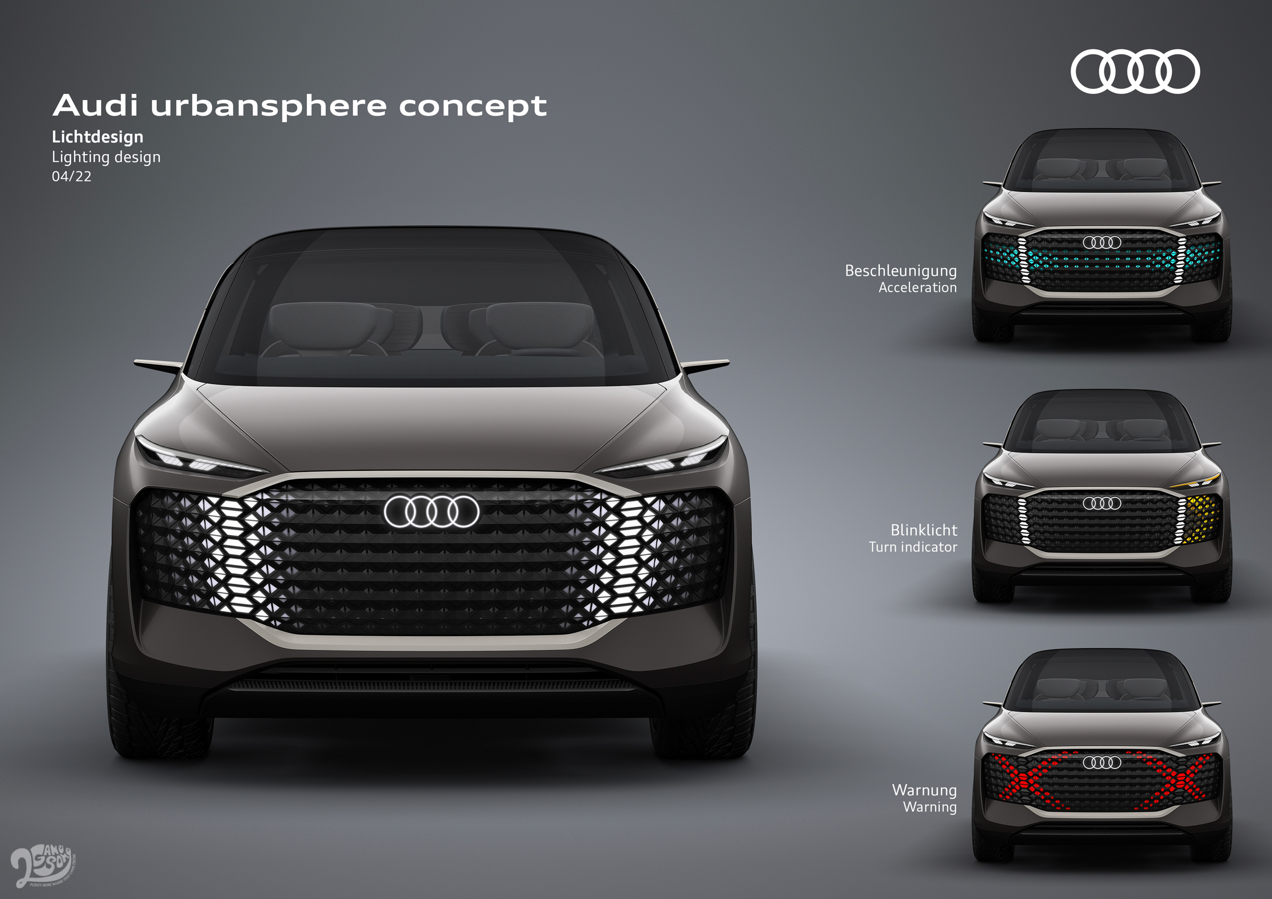 Audi urbansphere concept 採用長軸距、短前懸的四環電動車經典設計語彙,而團隊在車頭外觀設計部分亦作創新突破,採八角型的造型,雖Singleframe 已非擔任過往進氣閘口的功能,於urbansphere 上藉由創新數位化科技,Singleframe 演化為「Audi Light Canvas 燈光畫布」可對外進行溝通,透過動態燈光效果向其他道路使用者發出如 Warning 警示、Acceleration 加速中及Turn indicator轉向指示等溝通信號;而車頭上方左右兩側照明設計呼應四環 Logo 圓圈交疊的部分,如眼睛瞳孔的「Audi Eyes」,可自動偵測適應交通狀況、環境、甚至乘客的情緒,於日間行車燈啟動時,像虹膜般調整燈光的聚焦程度,展演更進化的燈光科技。