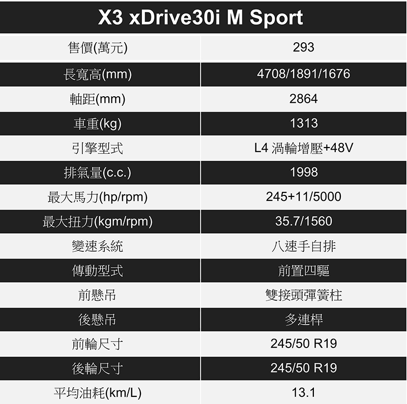 BMW之前推出小改X3,雖僅是小改規模但卻給予不少誠意,首先車型編制部分有所調整外,外觀造型與配備等處也進行升級,甚至連動力系統也導入48V輕油電,相對也替動態帶來更優異表現。