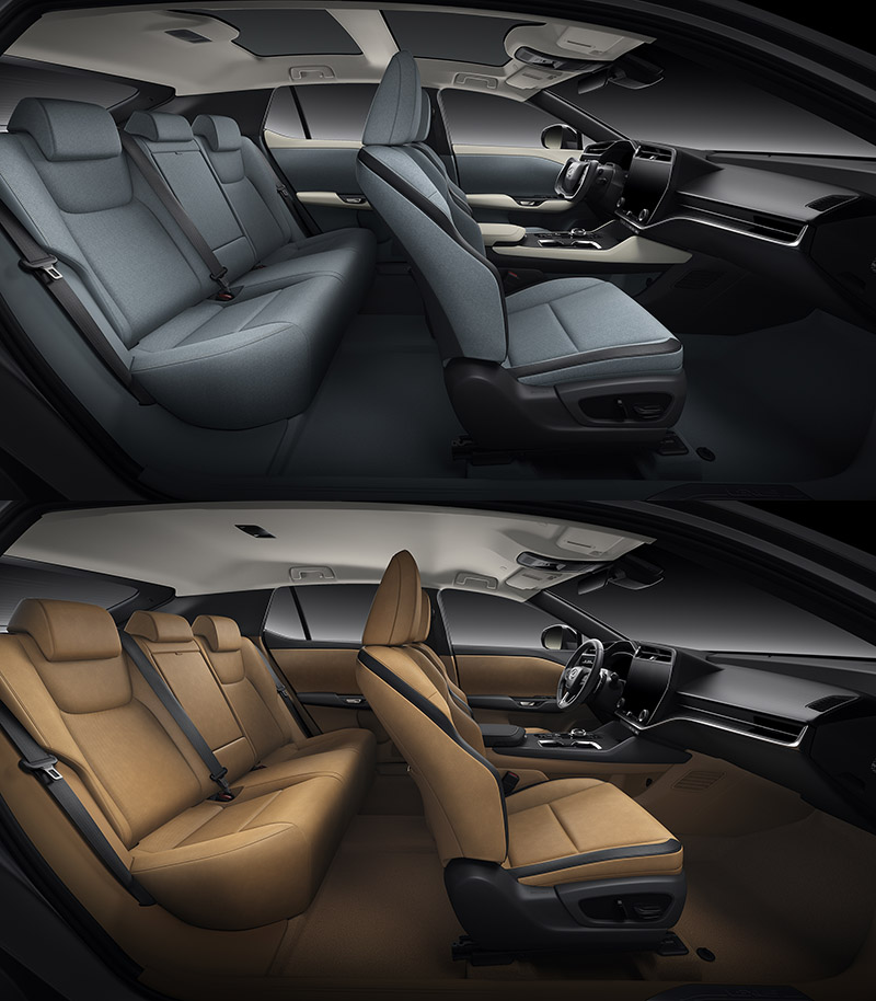 中控台配置14吋觸控液晶螢幕。 進入車內,同樣可以感受到Lexus一貫的極簡設計,配置全數位化座艙,中控台配置14吋觸控液晶螢幕,與HUD抬頭顯示器;拜常軸距與電動車機械佔用空間較小的優勢下,後座具有長達1000mm的縱向空間,同時提供兩種座椅材質,包括了具30%永續循環材質,並有Orage、Palomino和Dapple Gray/Black三種內裝配色可選擇,值得一提的是,其配有世界首創的Shadowy氣氛投射照明,在車門開啟或關閉時以投射光線於車門飾板上,就會映射出獨特的菱格圖案,別具特色。另外也可選配可變光全景天窗。