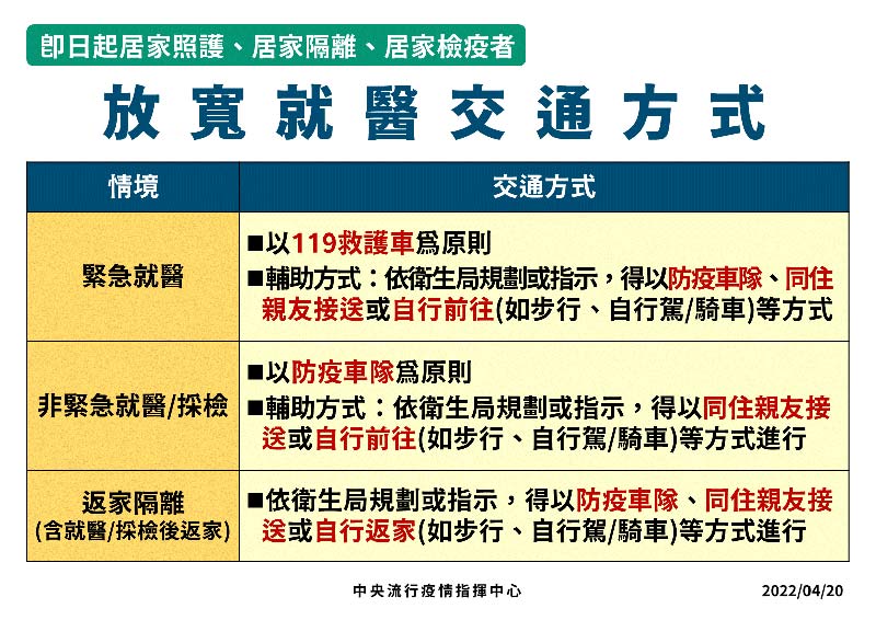 【健康醫療網/記者賴欣平報導】中央流行疫情指揮中心今(20)日表示,考量COVID-19本土疫情升溫,為確保民眾於居家隔離或檢疫期間,或確定病例於居家照護期間,若有相關醫療需求必須往返醫療機構時,可以及時前往,自即日起放寬有就醫或採檢需求之居家照護、居家隔離、居家檢疫者之交通運送方式,以保障病人就醫安全以及保全醫療運送量能。