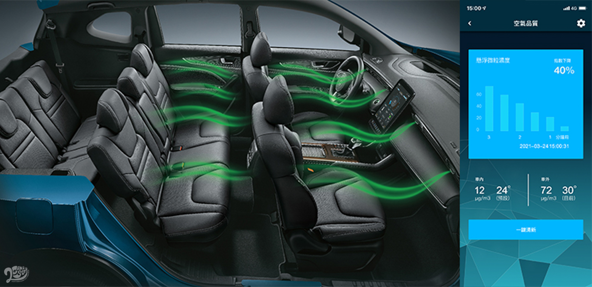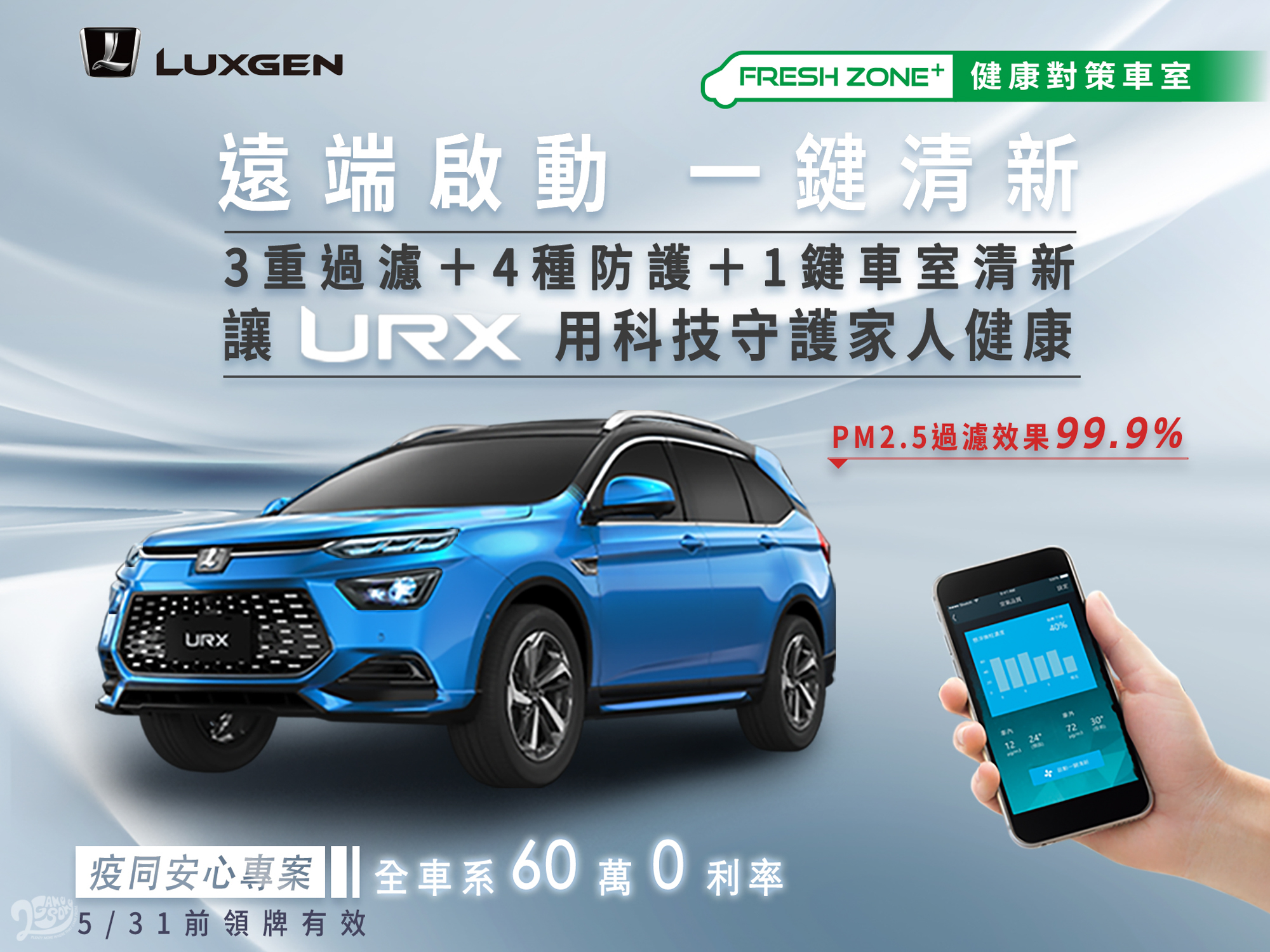 Luxgen「URX 7 人全景樂活版」與「URX 7 人旗艦紳活版」標配「LUXGEN FRESH ZONE+ 健康對策」,搭載 LINK+ 智聯網,可透過手機 AR 遠端遙控發動車輛,在進入車內前即啟動「一鍵清新」功能與「PM2.5 健康對策濾網」(1),結合醫療級口罩濾材及負離子清新濾網,具有「三層過濾、四種防護」功效,預先有效過濾空氣中 99.9% 的 PM2.5 有害懸浮微粒,同時並可抑制包含大腸桿菌、金黃色葡萄球菌功能、肺炎桿菌等有害物質。