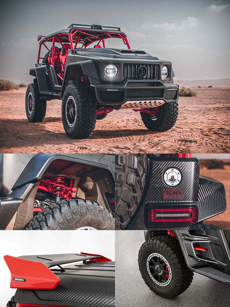 Brabus 900 Crawler基本上就是把一輛G63全部拆空,僅剩基本底盤結構,換上碳纖維/凱夫勒複合材質製成的外露式車身,以及紅色烤漆鋼管結構、碳纖維車頂、碳纖維引擎蓋,再配上車頂LED探照燈與擾流尾翼,懸吊系統也經過重新改裝,裝上了Brabus新開發的高低、軟硬可調避震系統,可提供達160mm彈簧行程,車底離地高度加高到驚人的53cm,輪胎尺寸為40 x 13.50 R 20,搭配Brabus Monoblock HD鍛造鋁圈,並配有鋁合金車底護板。