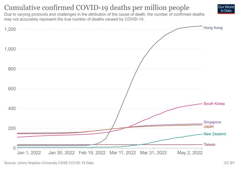 ▲新加坡、韓國、日本、紐西蘭、香港百萬人新冠死亡人數。