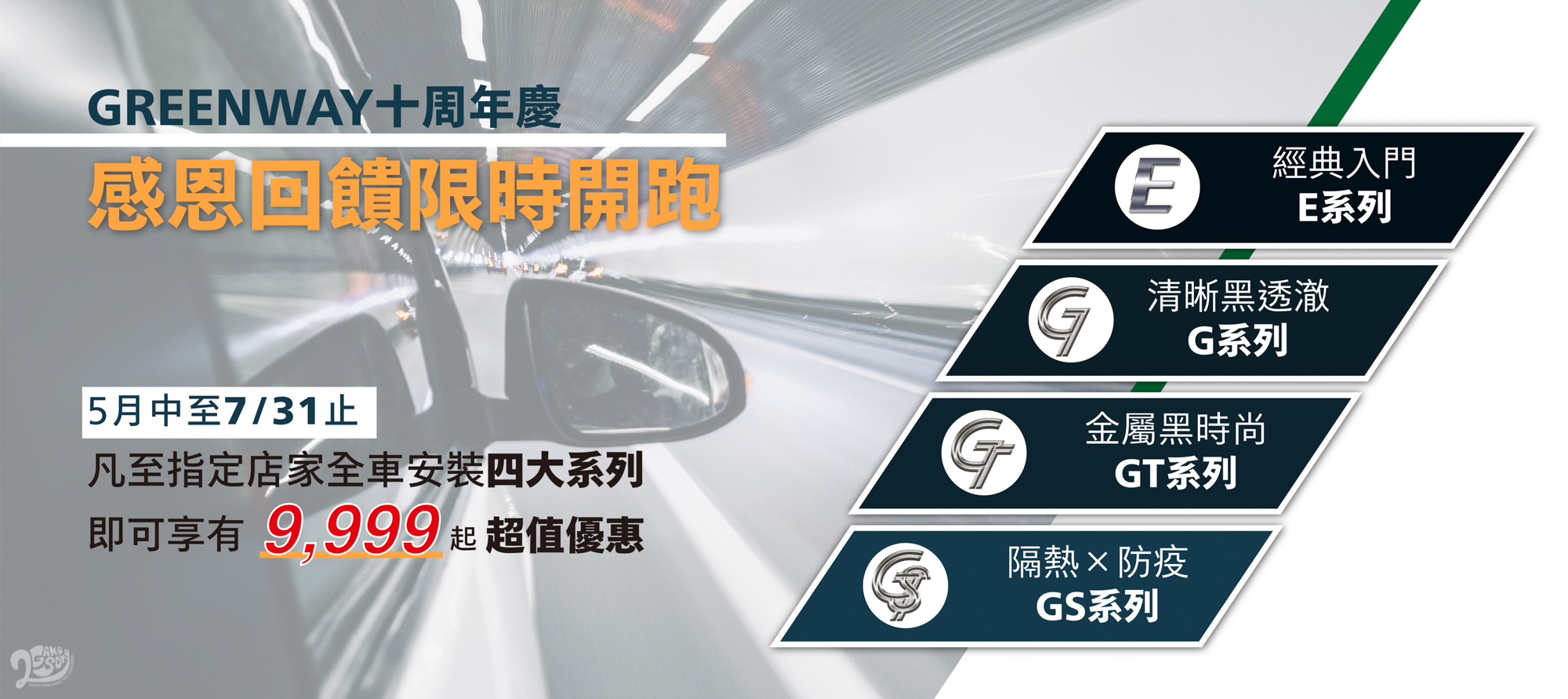 新竹老字號名店「宏竹汽車大樓隔熱紙旗艦店」負責人兼資深規劃師─邱淑娟表示:「透過規劃師專業轉型帶起了客製化配置的風潮,提供給消費者更專屬的服務品質。」GREENWAY 目前全台合作的隔熱紙規劃師據點累計超過百家,十年來共同服務了數十萬名車主,締造高達 9 成回購率的亮眼成績。完成十年里程碑的 GREENWAY 秉持著守護的初心,串連了全台規劃師一起捐贈 10,000 才的抗病菌隔熱紙 GS 禦守系列,五月中起提供全台(不含離島地區)教育、醫療及防疫前線等立案機構申請建築免費安裝。此外,對於支持並喜愛 GREENWAY的車友們,五月中起針對旗下「E 系列」、「G 系列」、「GT 系列」以及「GS 系列」,也祭出了十周年的感恩回饋的限時優惠,最低全車安裝只要 9,999 元起。