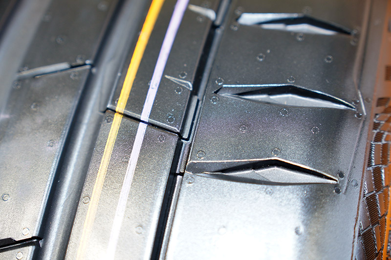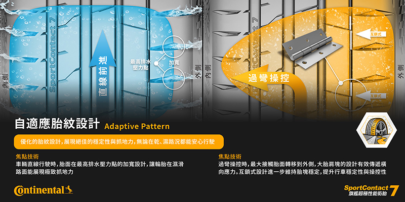 ●不對稱、自適應胎紋設計,讓全新SportContact 7在乾地、及濕滑路況都能發揮最佳性能,即使處於高速行駛狀態,也能維持精準操控性。全新自適應胎紋設計提供安全性、駕馭自信,以及非常精準的濕地與乾地路況過彎穩定性,這都源於創新的胎面的花紋設計。在行駛時,輪胎接觸地面的位置止於最高的排水胎紋點,因此能在濕地煞車、加速與過彎時提供優異的抓地力。當在乾地路面過彎時,接觸位置轉移到外側大胎肩設計,此設計為能傳輸最大的作用力進而帶來穩定操控性。外側胎肩的全新「互鎖設計」確保進一步的穩定性:它限制胎面的移動幅度,帶來高度的駕馭穩定性。