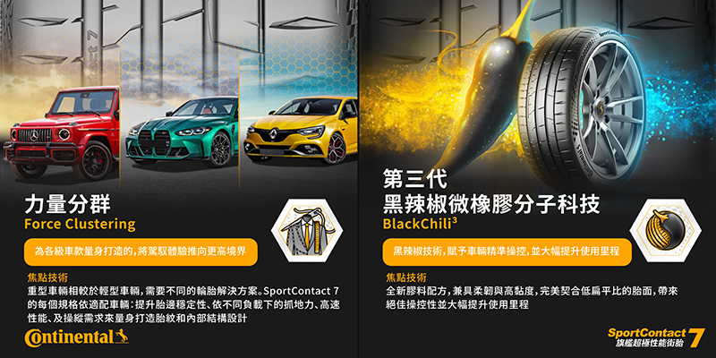 ●力量分群(Force Clustering)量身打造解決方案,傳統運動性能輪胎會在不同車輛款式與尺寸呈現不同性能——這取決於車輛的重量、大小與引擎。在高性能輪胎類別,全新SportContact 7是馬牌第一款為每一種車輛量身打造的產品。重型車輛與輕型車輛必須有不同的輪胎解決方案,SportContact 7的每個不同規格會根據每個車輛等級進行修改。工程師與研究人員根據輪胎尺寸開發了新技術,讓駕駛每一種車輛都能獲得SportContact系列的完美駕馭感受,除了為不同車輛等級量身打造的胎面設計。更還針對每一種汽車等級的試配輪胎設計力量分群(Force Clustering)解決方案,提升了胎邊的穩定性、依不同負載下的抓地力、高速能力、及操控需求來量身打造胎紋和胎體結構設計。 ●第三代黑辣椒(BlackChili3)微橡膠分子科技,是SportContact 7的第三個技術基石,精準對應胎紋所研發出的膠料。這種柔韌的聚合物完美契合非常堅固的低扁平比輪胎設計,不僅能帶來絕佳操控性,更能大幅增加使用里程數。為了實現這一點,德國馬牌的輪胎工程師與化學家必須在各種衝突目標找到平衡點。他們的合作成果就是一項非比尋常的混合聚合物技術──這項技術加上胎面設計後能大幅提升操控性。