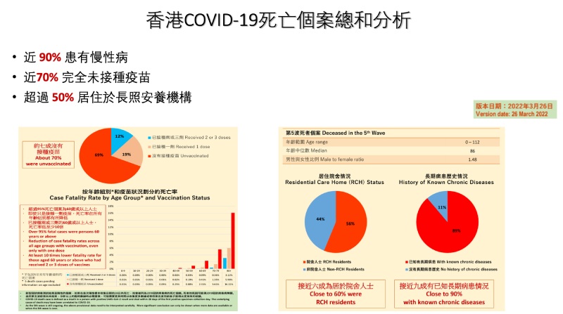 【健康醫療網/編輯部整理】根據中央流行疫情指揮中心(5/6)公布本土病例分析,四月一月起重症患者70人,其中六十歲以上長者佔78.6%,重症死亡43人中就有38人有慢性病或癌症病史,比例高達88.3%。以上數據與香港三月份Omicron疫情高峰頗為近似,香港大學李嘉誠醫學院副教授葉逸軒醫師分享香港醫管局病例分析,香港COVID-19死亡個案中,逾50%居住於長照安養機構,有慢性病史近90%,這些族群都是COVID-19重症與死亡的高風險族群,粗估國內帶有高危因子的百萬族群,不可不慎!