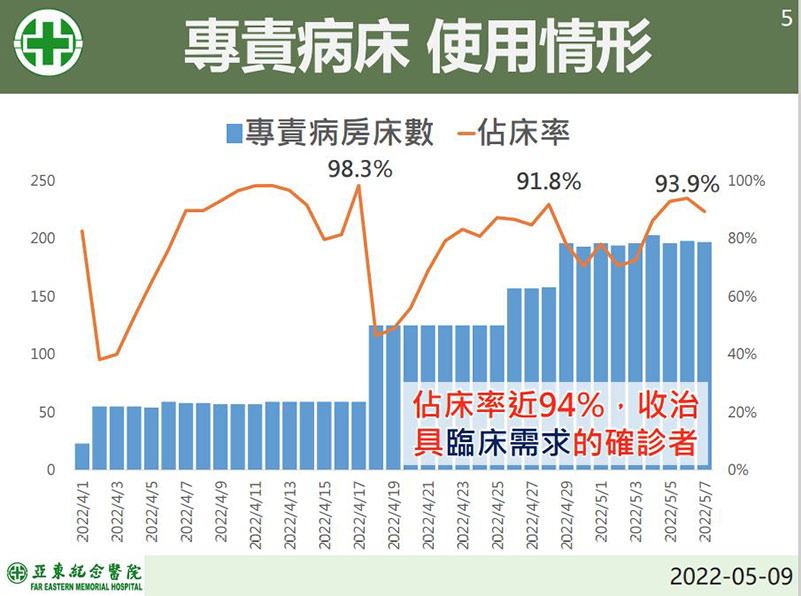 以亞東醫院為例,邱冠明提到,自今(2022)年4/1起院內專責病房比例即不斷拉高,目前專責病房實際收治床數已超過全院床數1/4。然而,更可怕的是因此而衍生的醫護人員調配負擔,以及隨之而來的「醫護人員相繼確診與居隔」之風險,恐陷入醫療量能再度下降的惡性循環。邱冠明強調,由此可知,不斷加開專責病房對全台任何一個醫療機構或對國內防疫政策來說,「都不是一個好方式」。