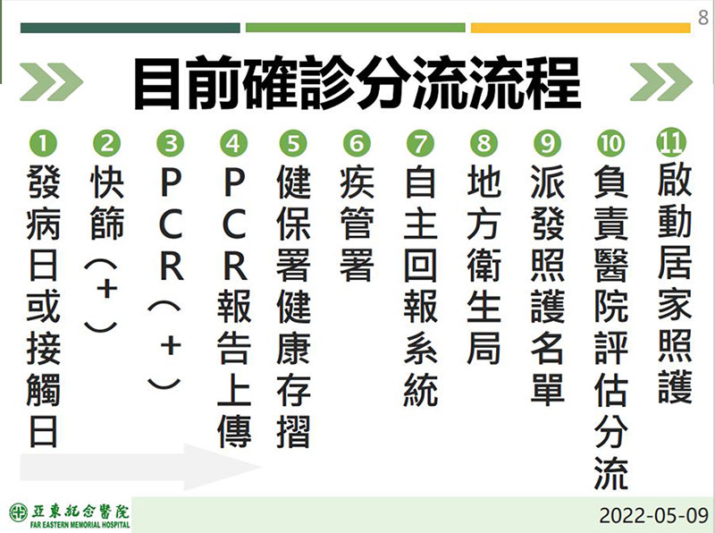 亞東醫院身為全台灣第一間執行居家照護的醫學中心,於過去一個月累計接收派案逾2萬2000人次,其中,竟有超過兩成確診者呈現「失聯」或是電話不通的狀態。邱冠明提醒,確診者在做PCR採檢時「一定要更新手機電話」,才能有效發揮居家照護的效果,而確診者不論是居家照護或於集檢所中隔離,都會透過遠距通訊診療的方式,以及時獲取抗病毒用藥。