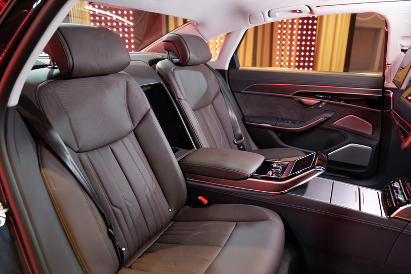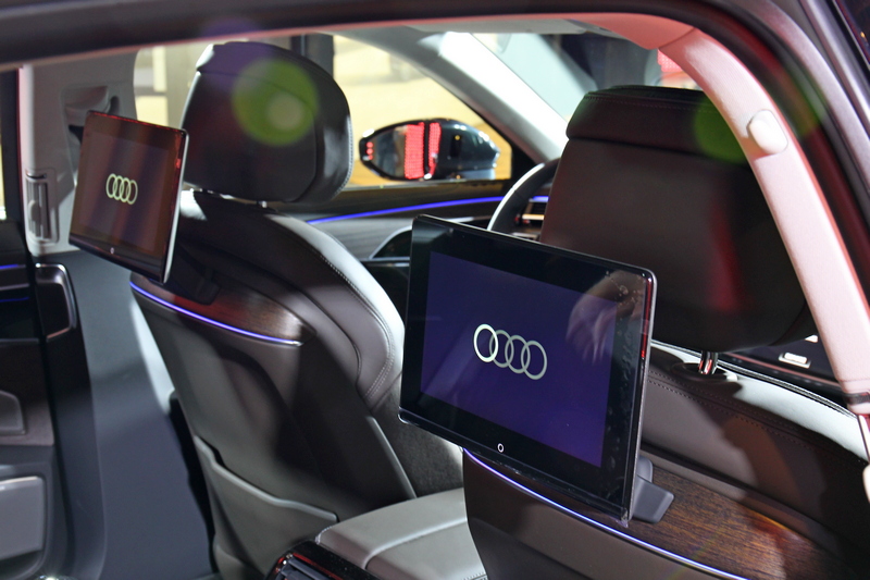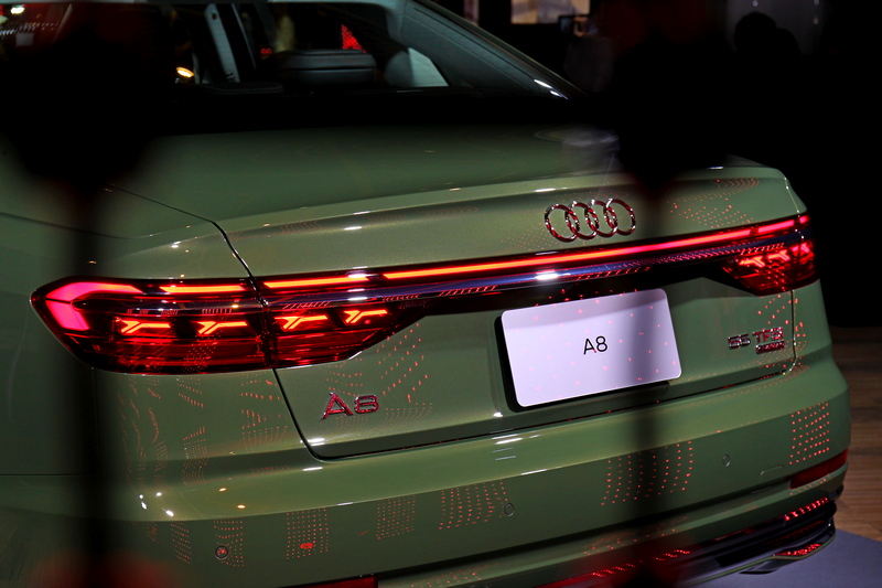 A8同樣搭載Audi頂尖數位燈光科技,全車系標配HD Matrix 高階矩陣式 LED 極光頭燈組及數位式OLED尾燈,其中數位式OLED尾燈除視不同車型及調至「動力Dynamic模式」配有專屬離家與返家的動態展演功能,給予具科技質感的行車體驗之外;OLED燈組於下列情況將啟動車輛警示功能,如當車輛於靜止時,系統偵測到後方來車距離低於二公尺,所有 OLED 燈組光源會全數亮起以警示後方人車注意,提升後方辨識度與道路安全性,搭配車內全方位安全輔助系統,進而保障全車乘員及周圍用路人的行車安全。