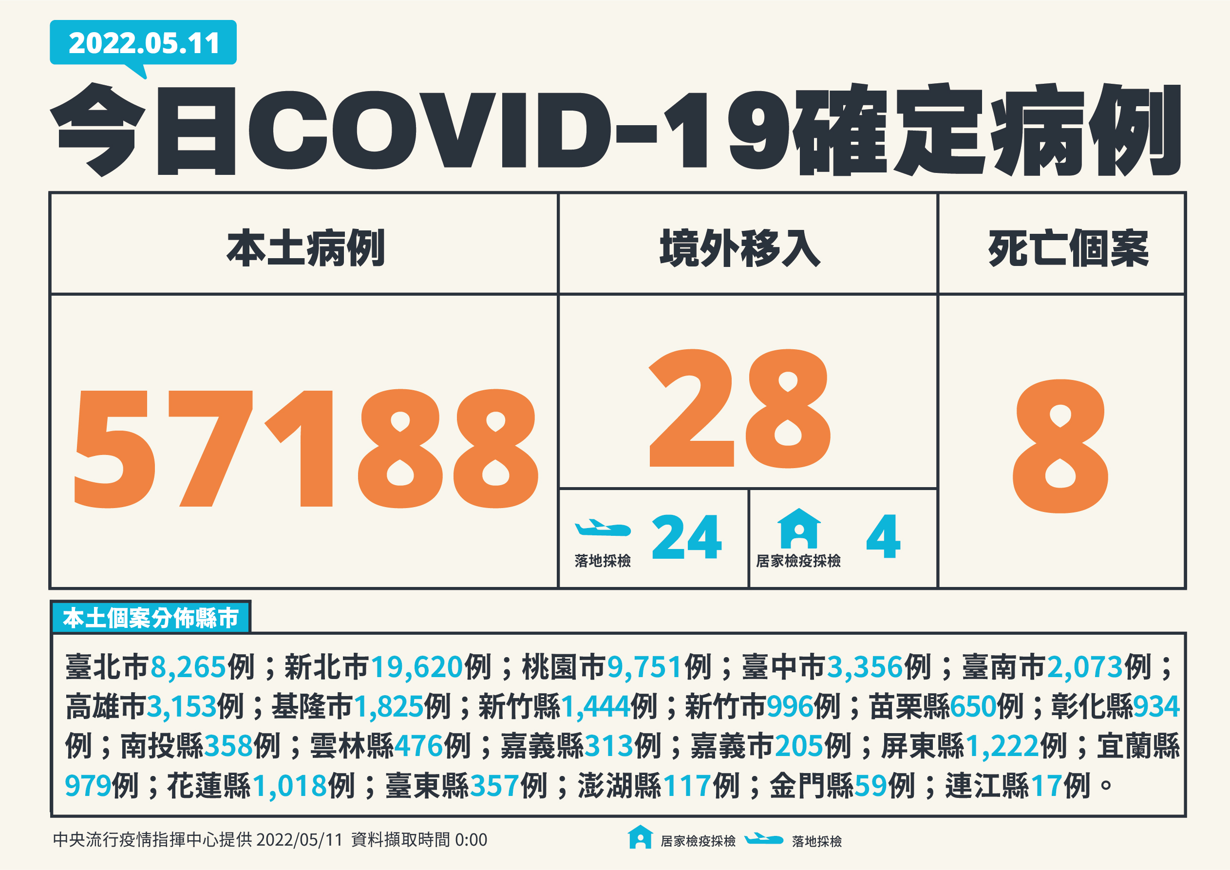 【健康醫療網/記者林哲遠報導】中央流行疫情指揮中心今(11)日公布國內新增57,216例COVID-19確定病例,分別為57,188例本土個案及28例境外移入(24例為航班落地採檢陽性);另確診個案中新增8例死亡。此外,「快篩陽性即確診」明日將上路,指揮官陳時中公布,居家隔離、自主防疫及居家檢疫期間快篩陽性通報流程,以及視訊診療前的四大準備事項。
