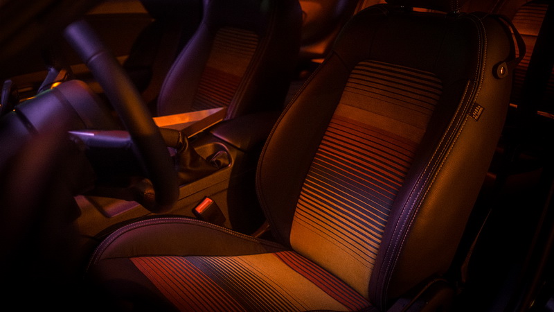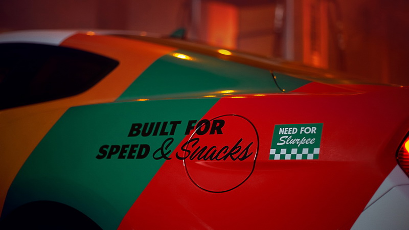 7-11打造的這部2021年式Mustang是以經典的紅、綠、白、橘配色作為車身彩繪,輪圈還換上綠色款式讓整體感受更為搶眼,輪圈中央也以專屬的數字7呈現,最特別的是原本車頭的躍動野馬廠徽被換成了貓頭鷹,原因是在1940年代7-11創立初期比別的商店開的更晚,因此在廣告上以貓頭鷹作為營業時間的象徵;內裝部分同樣將紅、綠、白、橘的企業配色融入座椅設計,但最有趣的是還將思樂冰的杯子輪廓作為排檔桿的造型不禁讓人會心一笑,另外置杯架也重新規劃為可放入思樂冰的尺寸,並在後方設計有一個特殊的披薩置放架。