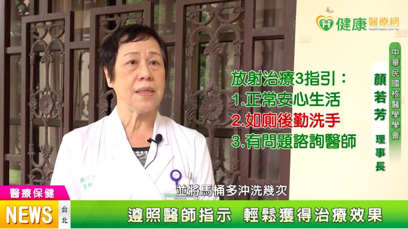 顏若芳理事長提醒,接受新型放射性同位素標靶治療後,患者不用擔心會有體外輻射暴露的風險,只要記得上完廁所要將手及馬桶沖洗乾淨;另外一周內若有需要接受侵入性診療,可以先跟核醫科醫師討論評估,便能輕鬆重拾良好生活。