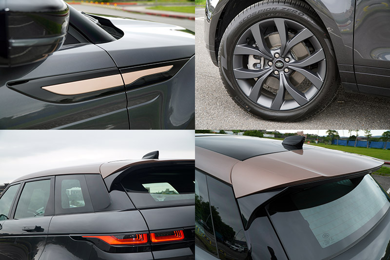 在新年度推出的Range Rover Evoque Bronze Collection,是以P250規格所衍生,在外觀上,最明顯的改變,就是在包括:車頂、尾翼與左右前葉子鈑飾板部分採科林斯青銅色,並且搭配20 吋緞光深灰鋁合金輪圈,並可選擇喀爾巴阡灰、聖托里尼黑與首爾珍珠銀三款車色,整體搭配,增添與眾不同地氣質。
