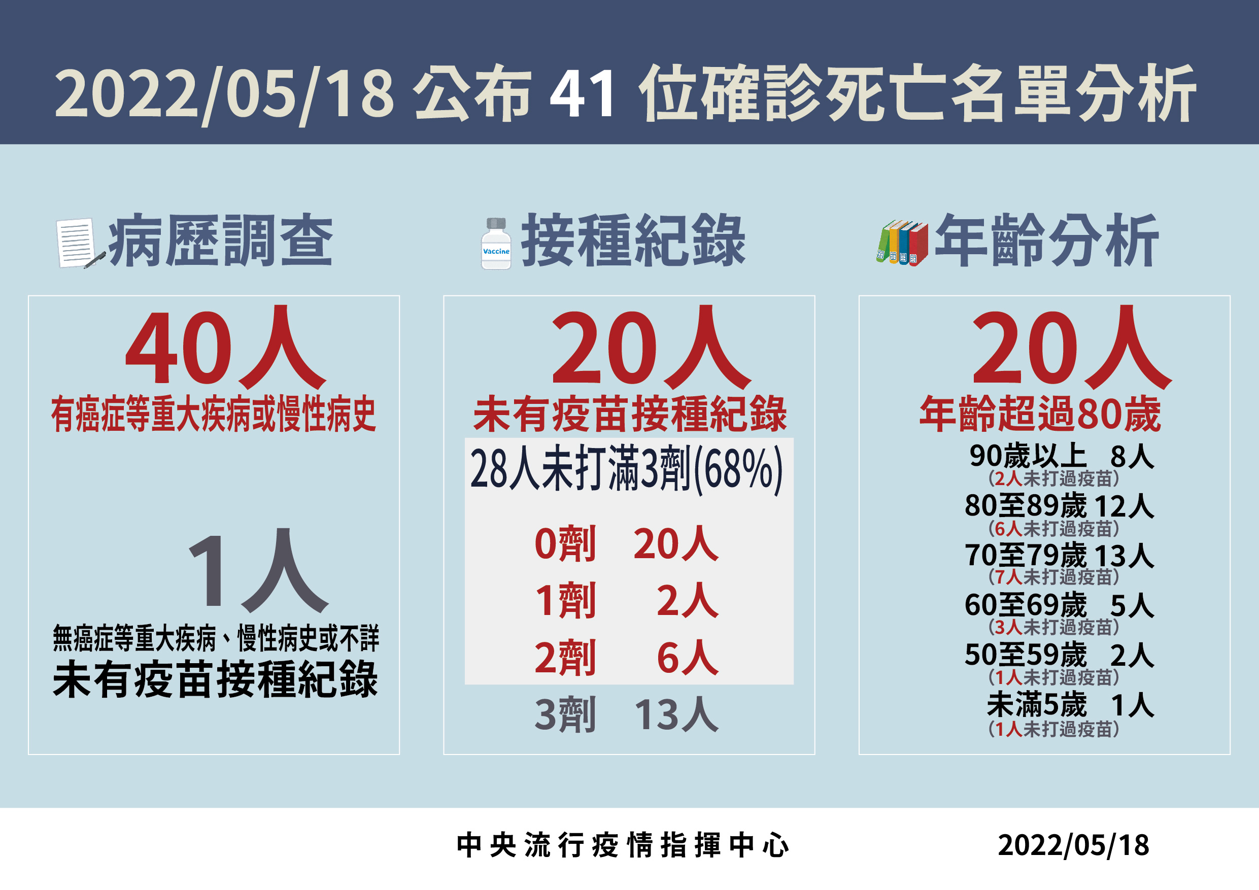 指揮中心指出,今日新增41例本土病例死亡個案,為25例男性、16例女性,年齡介於未滿5歲至90歲以上,皆屬重度感染個案、40例具慢性病史、20例無疫苗接種。確診日介於今(2022)年4月19日至5月15日,死亡日期介於5月11日至5月15日。