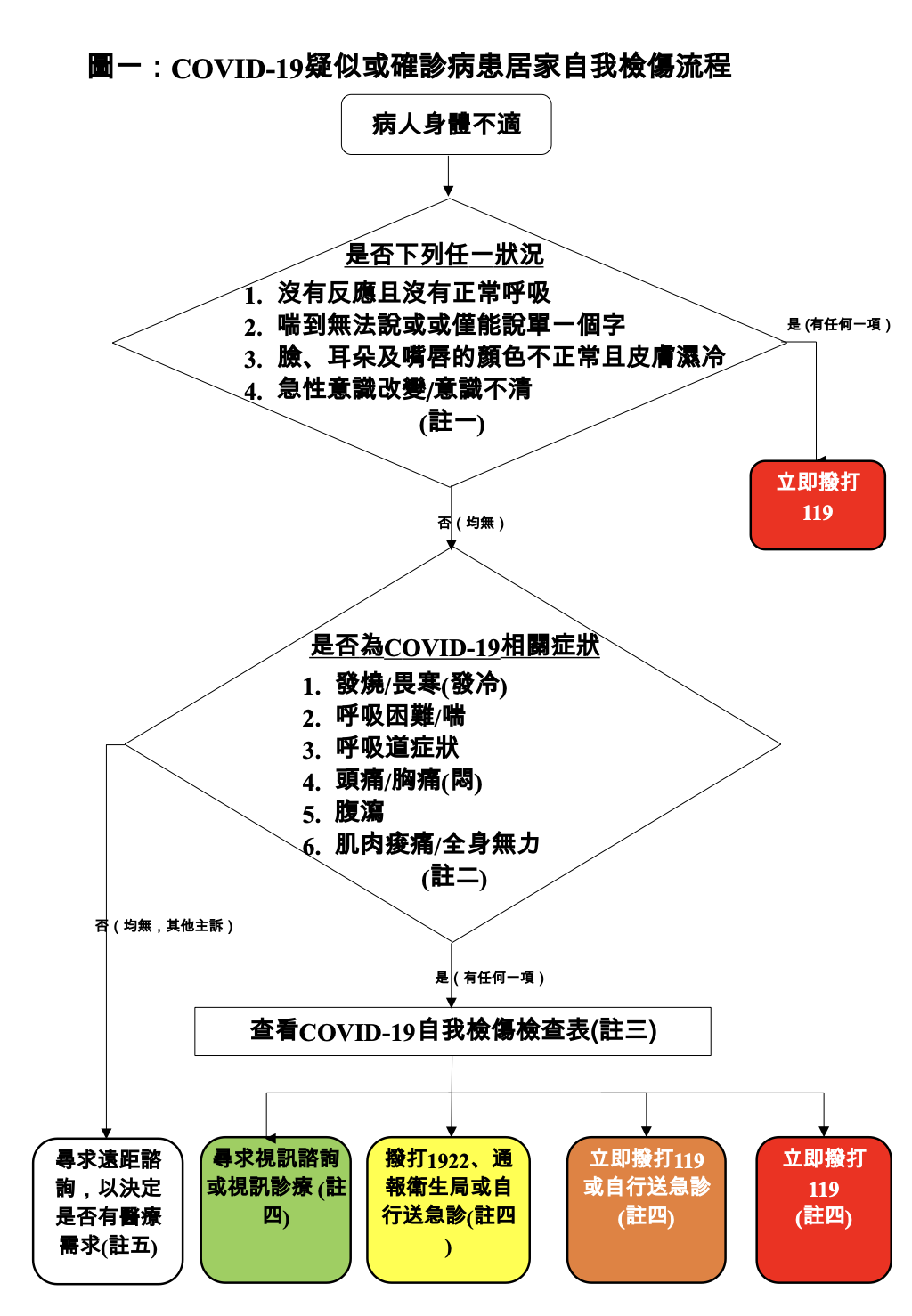 註五:若病人此次所欲查詢的症狀並非COVID-19相關症狀(如),可以遠距醫療諮詢(如健康益友APP、COVID-19居家照護期間衛生局提供之電話專線…等),由遠距醫療或居家照護醫療團隊評估,以決定是否就醫。