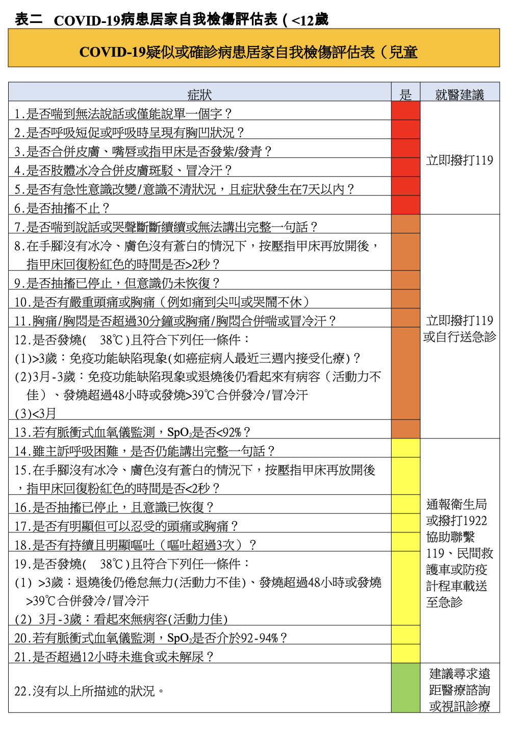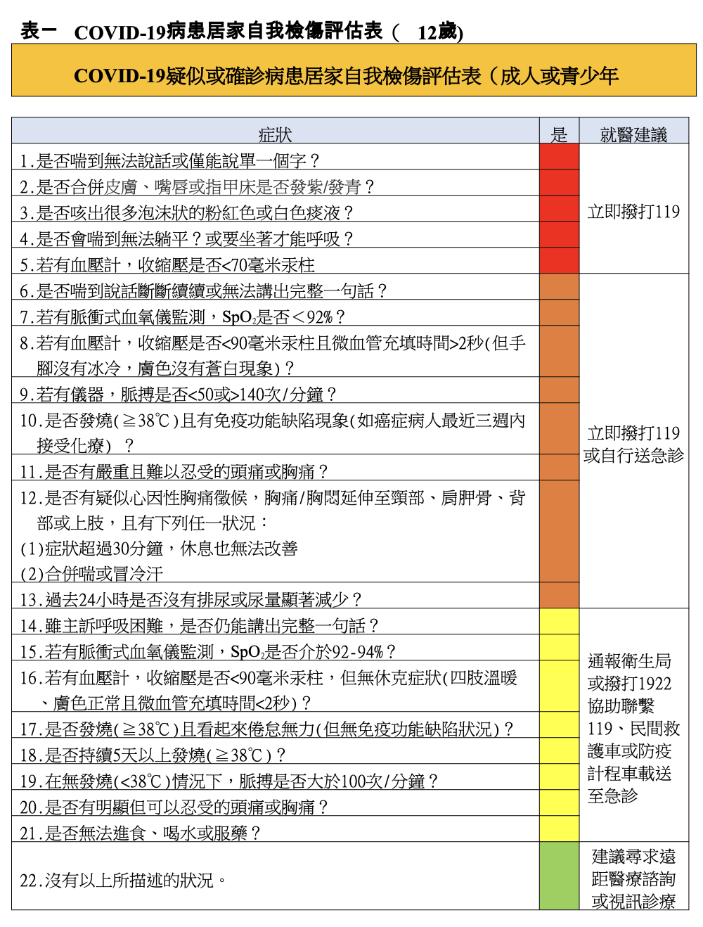 【健康醫療網/記者林哲遠報導】近日本土疫情持續升溫,許多醫院急診室外出現大排長龍的民眾等著做PCR檢測、不少輕症確診者也會在慌張下撥打119,引發各界擔憂醫療量能是否能支撐住。對此,台灣緊急救護醫療指導醫師學會前理事長、亞洲大學附屬醫院急診醫學科主任鍾侑庭醫師參考日本居家檢傷、我國疾管署、急診五級檢傷制定出,「COVID-19疑似或確診病患居家自我檢傷流程」與居家檢傷檢查表,給予民眾參考使用。