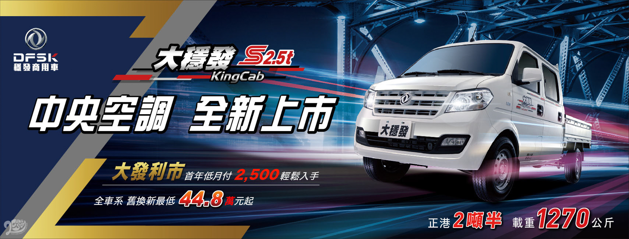 DFSK 穩發商用車旗下六期環保動力性能的大穩發 S2.5t 雙廂貨車,擁有正港兩噸半規格,雙廂四人座的設計,載重 1,270 公斤。為回饋消費者支持,DFSK 穩發商用車特別推出雙廂大穩發 S2.5 新增後座中央空調系統,即日起正式發售,建議售價新台幣 63.8 萬元。